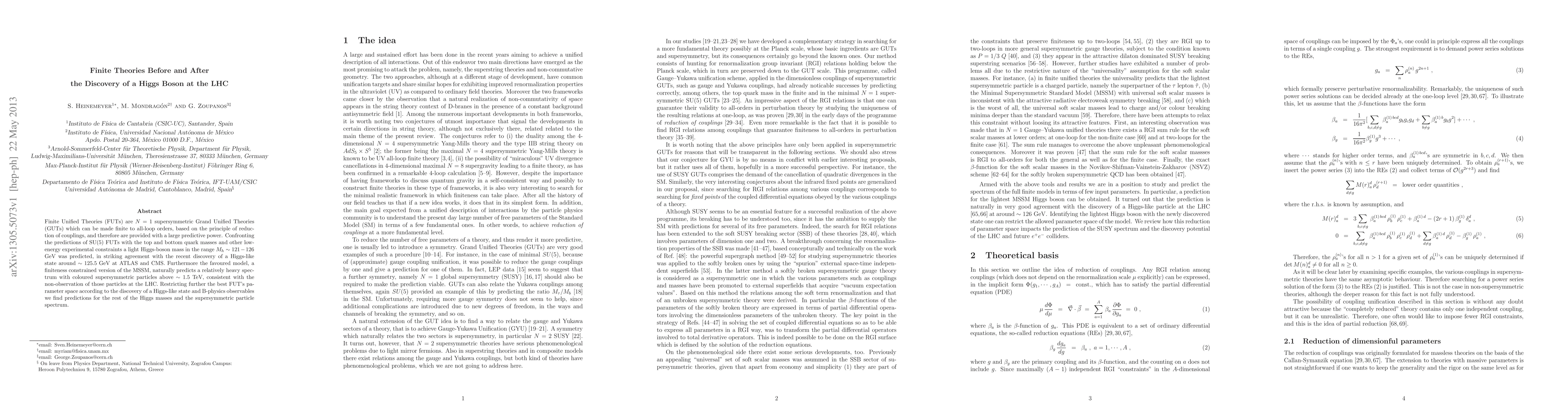 This paper discusses Finite Unified Theories (FUTs) that predict a light Higgs boson mass around 121-126 GeV, aligning with the recent discovery at the LHC. It also predicts a heavy spectrum for coloured supersymmetric particles above 1.5 TeV, consistent with current LHC observations.