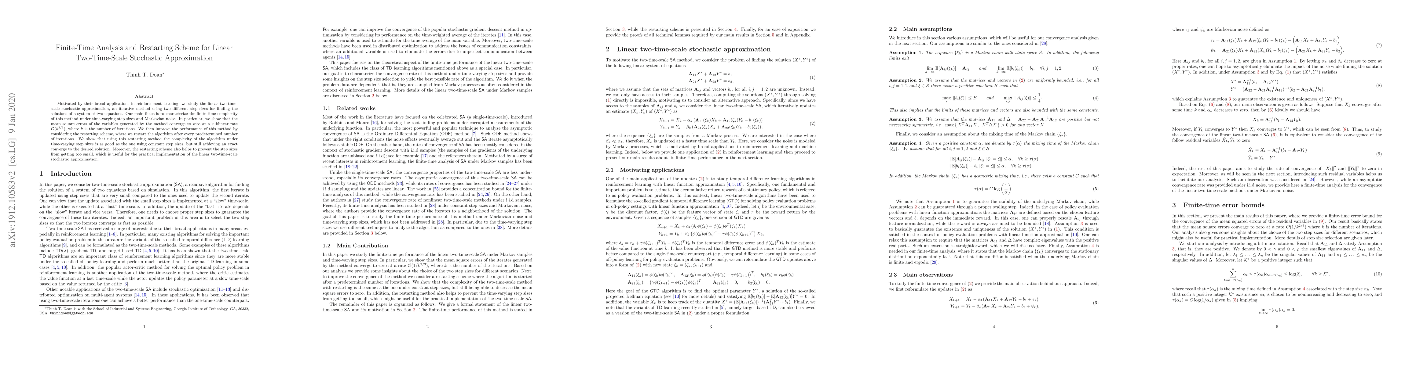 This paper investigates the finite-time complexity of linear two-time-scale stochastic approximation, focusing on its convergence rate under time-varying step sizes and Markovian noise. The authors propose a restarting scheme to enhance performance, demonstrating improved convergence akin to constant step sizes while preventing excessively small step sizes.