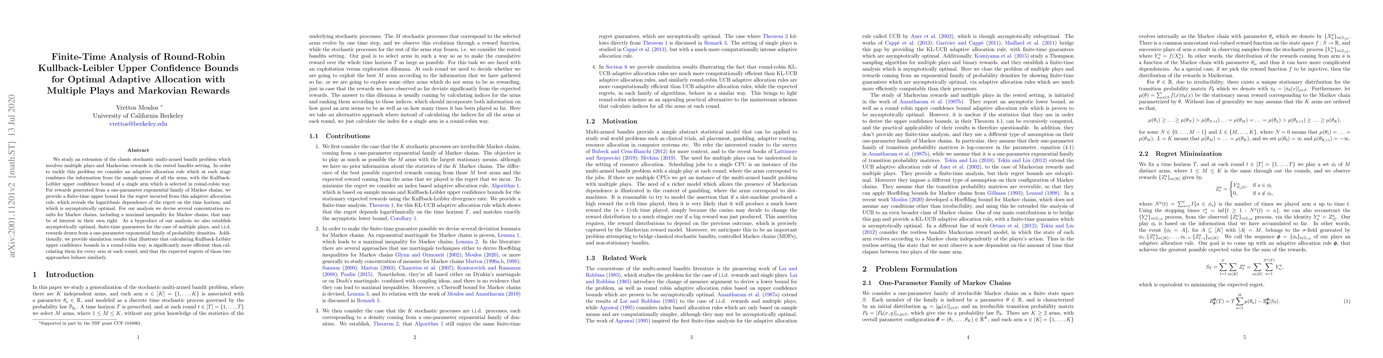This paper extends the stochastic multi-armed bandit problem to multiple plays and Markovian rewards, proposing an adaptive round-robin allocation rule. The authors provide a finite-time upper bound for regret, showing logarithmic dependence on the time horizon and asymptotic optimality, along with concentration results for Markov chains.