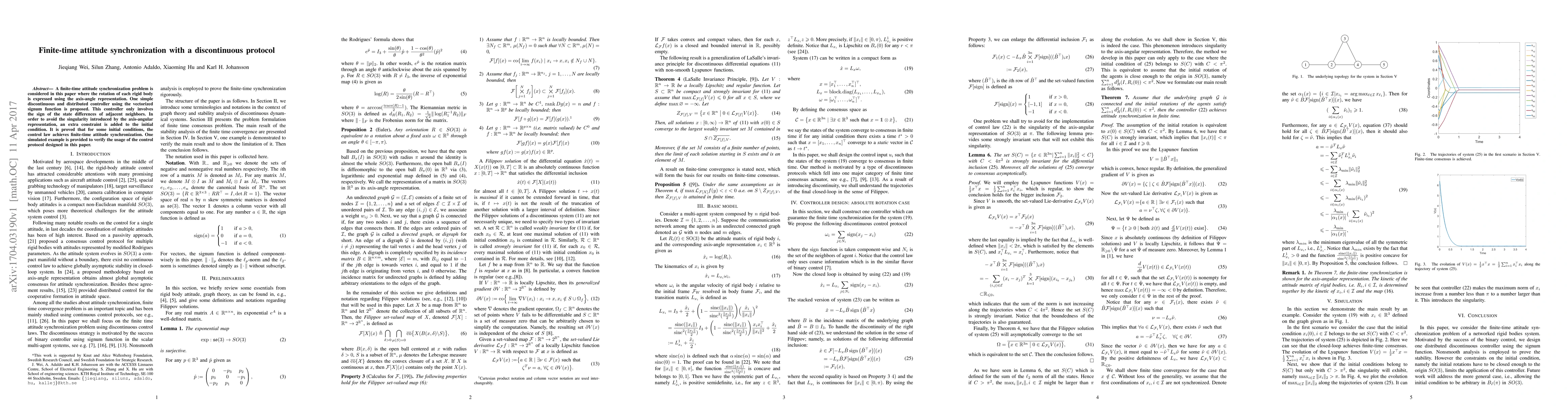 This paper proposes a discontinuous distributed controller using the signum function for finite-time attitude synchronization of rigid bodies, avoiding singularity through an initial condition constraint. The control law achieves synchronization in finite time for certain initial conditions, as demonstrated by a simulation example.