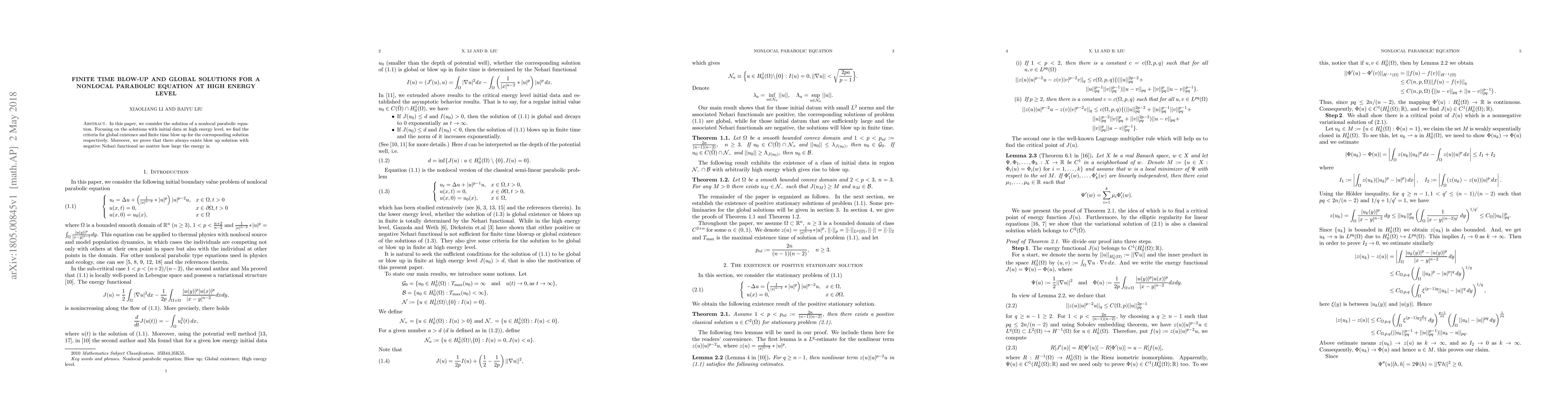 This paper investigates a nonlocal parabolic equation, determining criteria for global existence and finite time blow-up for solutions with high initial energy. It proves the existence of blow-up solutions regardless of energy level when the Nehari functional is negative.