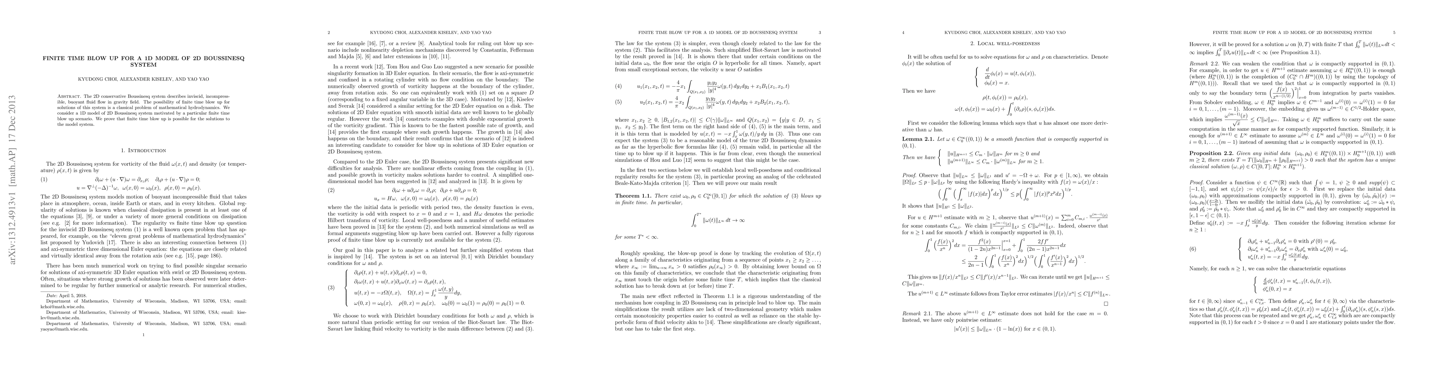 The research employs a 1D model of the 2D Boussinesq system to investigate finite time blow-up scenarios, using energy estimates and iteration schemes for smooth approximations of initial data.