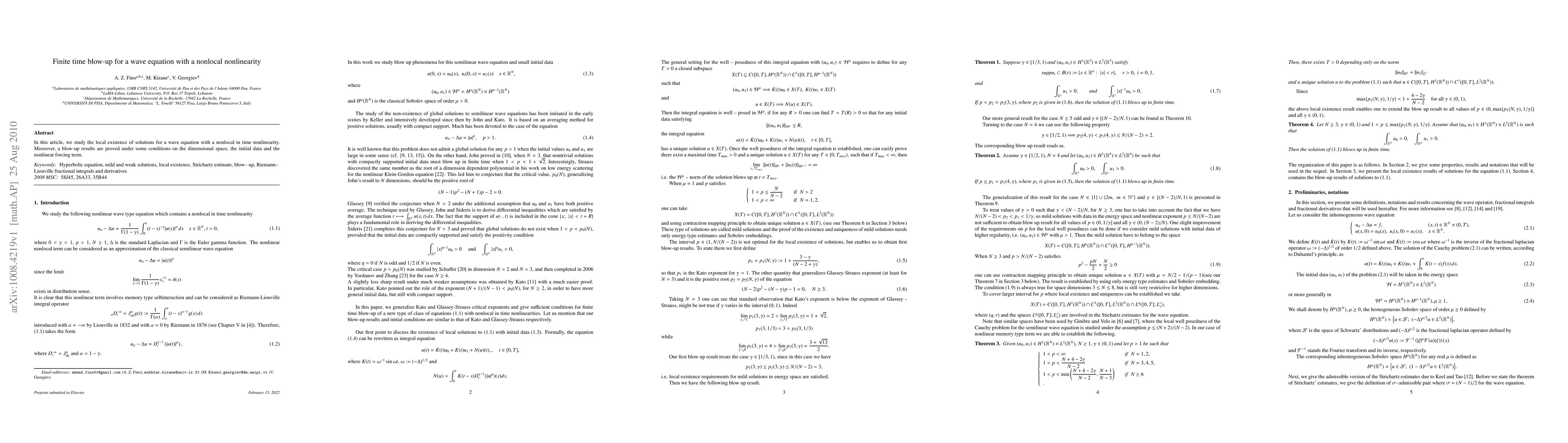 In this article, we study the local existence of solutions for a wave equation with a nonlocal in time nonlinearity. Moreover, a blow-up results are proved under some conditions on the dimensional space, the initial data and the nonlinear forcing term.
