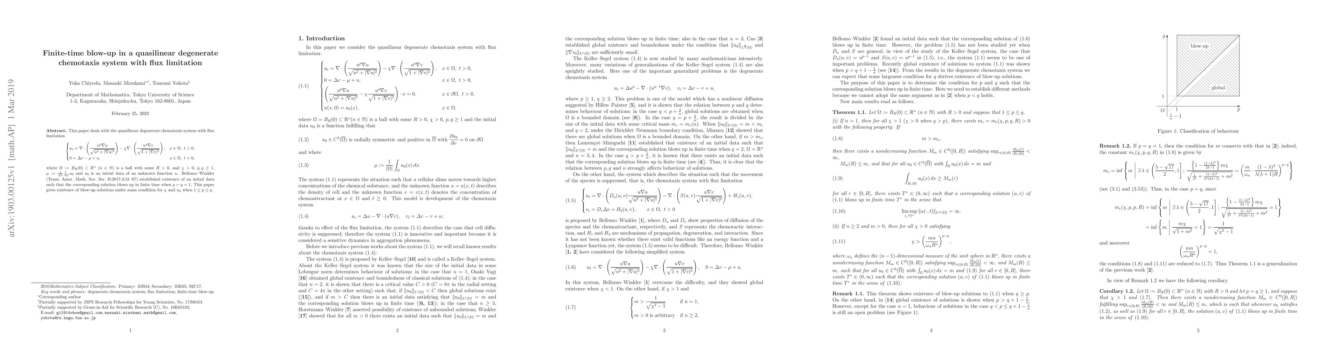 This paper investigates the quasilinear degenerate chemotaxis system with flux limitation, proving the existence of solutions that blow up in finite time under certain conditions for parameters $\chi$ and initial data $u_0$, extending previous results for $p=q=1$ to the case where $1\leq p\leq q$.