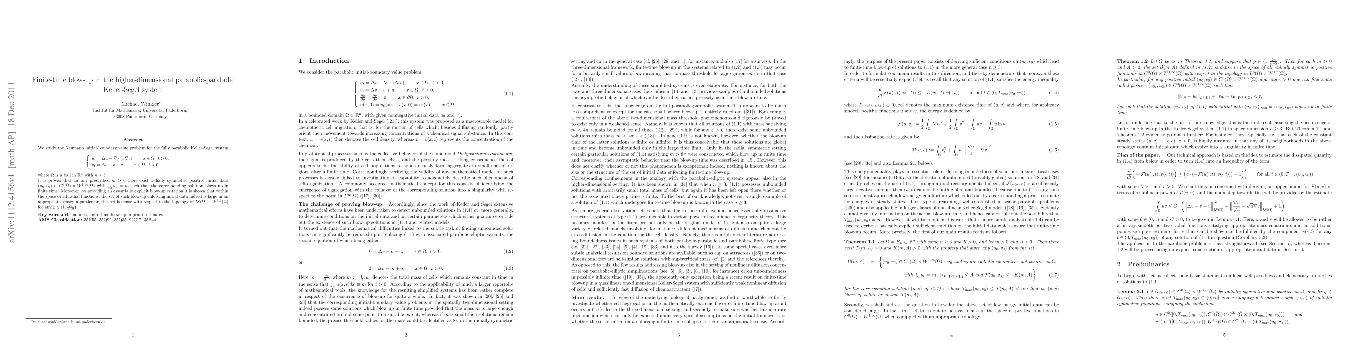 The paper presents a detailed proof of finite-time blow-up for the higher-dimensional parabolic-parabolic Keller-Segel system under specified initial conditions, along with a density argument for the set of blow-up enforcing initial data.