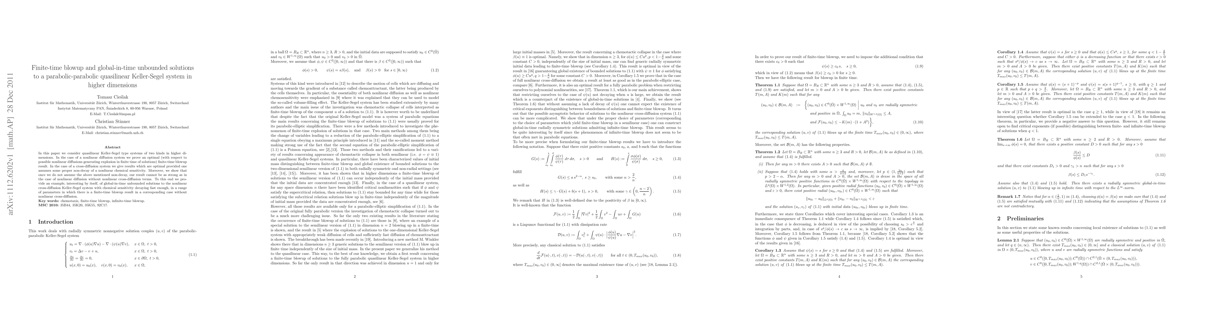 In this paper we consider quasilinear Keller-Segel type systems of two kinds in higher dimensions. In the case of a nonlinear diffusion system we prove an optimal (with respect to possible nonlinear diffusions generating explosion in finite time of solutions) finite-time blowup result. In the case of a cross-diffusion system we give results which are optimal provided one assumes some proper non-decay of a nonlinear chemical sensitivity. Moreover, we show that once we do not assume the above mentioned non-decay, our result cannot be as strong as in the case of nonlinear diffusion without nonlinear cross-diffusion terms. To this end we provide an example, interesting by itself, of global-in-time unbounded solutions to the nonlinear cross-diffusion Keller-Segel system with chemical sensitivity decaying fast enough, in a range of parameters in which there is a finite-time blowup result in a corresponding case without nonlinear cross-diffusion.
