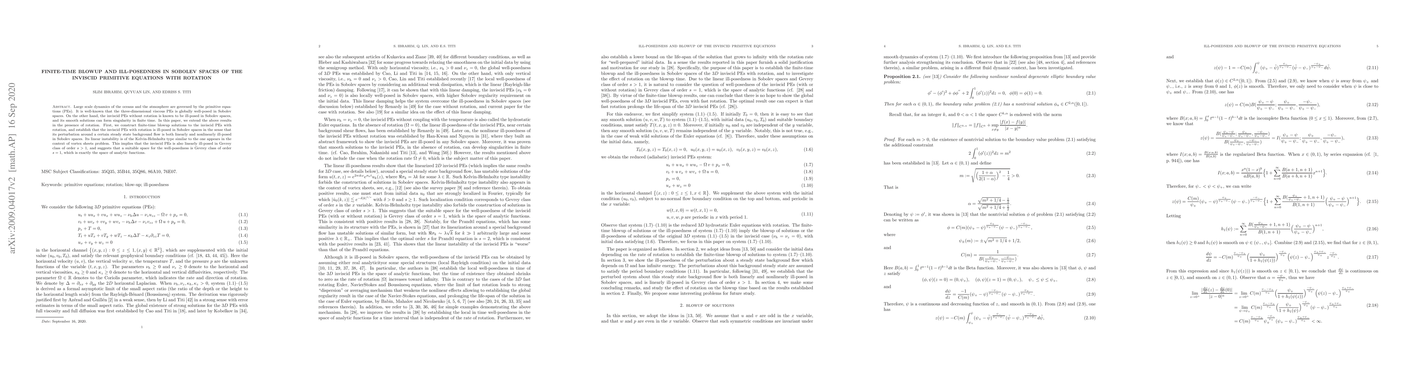 This paper investigates the finite-time blowup and ill-posedness of the inviscid primitive equations with rotation in Sobolev spaces. It constructs finite-time blowup solutions and demonstrates that the equations are ill-posed, with linear instability akin to the Kelvin-Helmholtz instability, suggesting well-posedness in the Gevrey class of order $s = 1$.