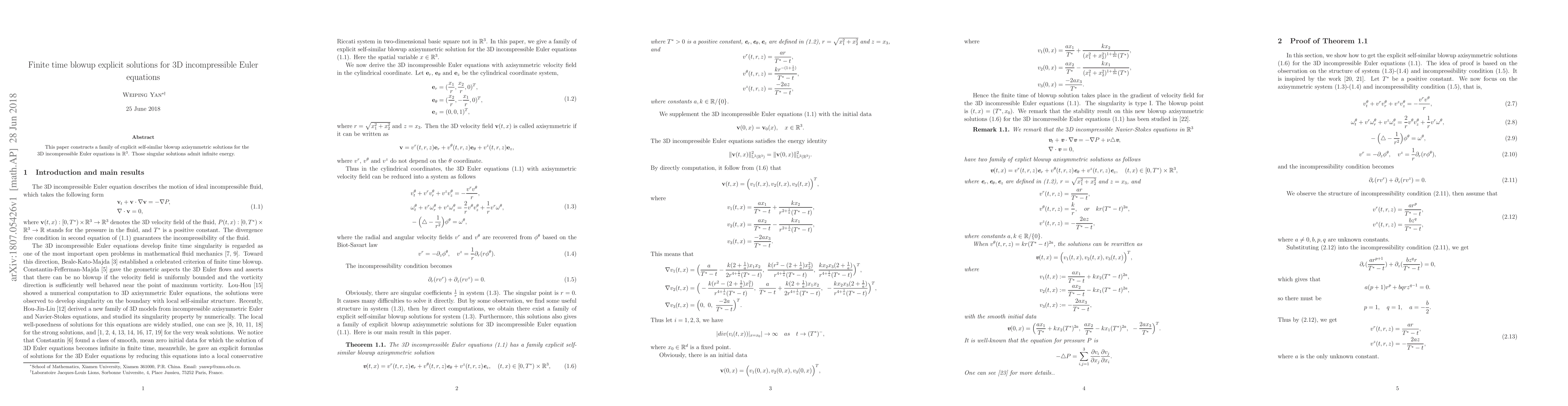 Summary: This paper presents explicit self-similar, axisymmetric solutions for the 3D incompressible Euler equations that demonstrate finite time blowup, showcasing infinite energy accumulation in the singular solutions.