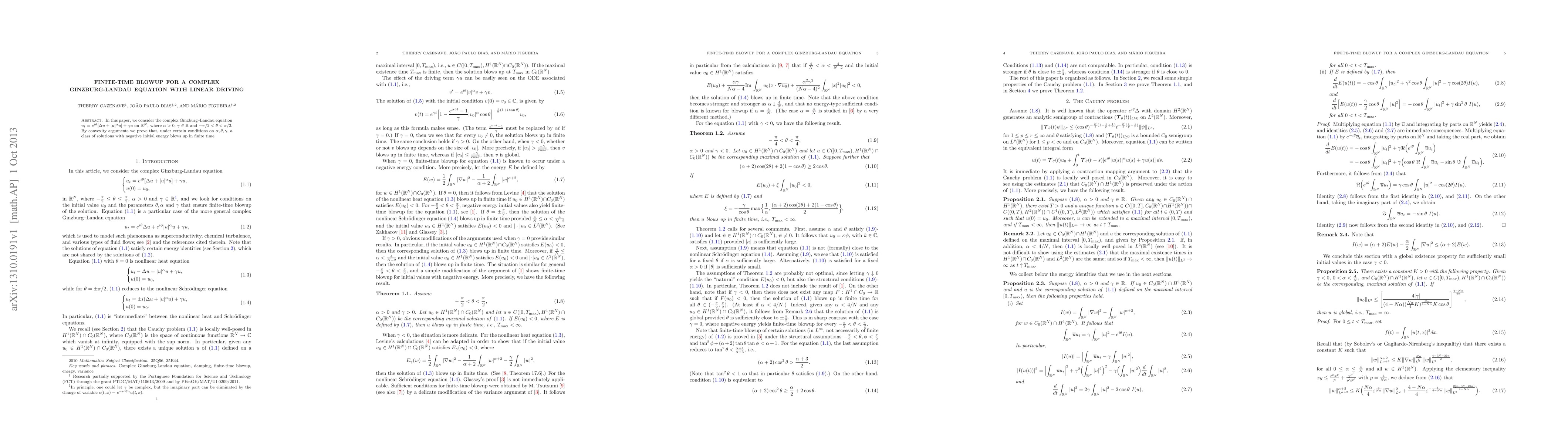 This paper investigates the complex Ginzburg-Landau equation with linear driving, proving that under specific conditions on parameters, solutions with negative initial energy exhibit finite-time blowup through convexity arguments.