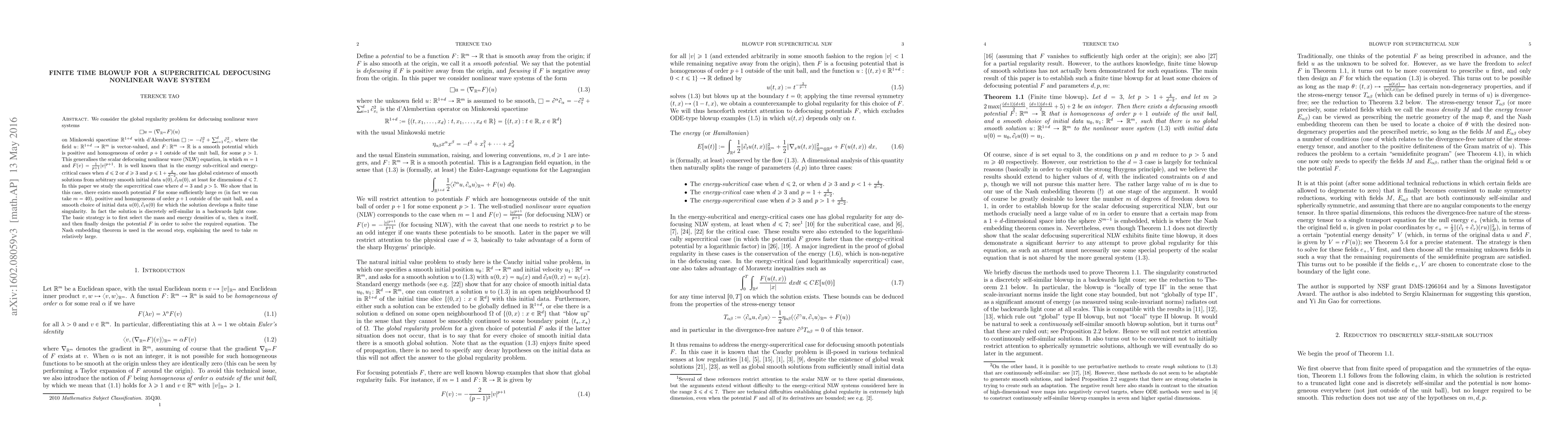 We consider the global regularity problem for defocusing nonlinear wave systems $$ \Box u = (\nabla_{{\bf R}^m} F)(u) $$ on Minkowski spacetime ${\bf R}^{1+d}$ with d'Alambertian $\Box := -\partial_t^2 + \sum_{i=1}^d \partial_{x_i}^2$, the field $u: {\bf R}^{1+d} \to {\bf R}^m$ is vector-valued, and $F: {\bf R}^m \to {\bf R}$ is a smooth potential which is positive and homogeneous of order $p+1$ outside of the unit ball, for some $p >1$. This generalises the scalar defocusing nonlinear wave (NLW) equation, in which $m=1$ and $F(v) = \frac{1}{p+1} |v|^{p+1}$. It is well known that in the energy sub-critical and energy-critical cases when $d \leq 2$ or $d \geq 3$ and $p \leq 1+\frac{4}{d-2}$, one has global existence of smooth solutions (for dimensions $d \leq 7$ at least) from arbitrary smooth initial data $u(0), \partial_t u(0)$. In this paper we study the supercritical case where $d = 3$ and $p > 5$. We show that in this case, there exists smooth potential $F$ for some sufficiently large $m$ (in fact we can take $m=40$), positive and homogeneous of order $p+1$ outside of the unit ball, and a smooth choice of initial data $u(0), \partial_t u(0)$ for which the solution develops a finite time singularity. In fact the solution is discretely self-similar in a backwards light cone. The basic strategy is to first select the mass and energy densities of $u$, then $u$ itself, and then finally design the potential $F$ in order to solve the required equation. The Nash embedding theorem is used in the second step, explaining the need to take $m$ relatively large.