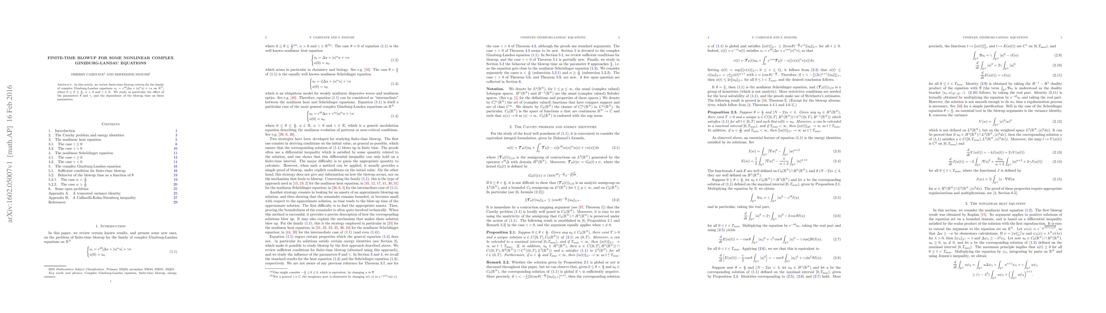 This paper reviews criteria for finite-time blowup in nonlinear complex Ginzburg-Landau equations, examining the influence of parameters $\theta$ and $\gamma$ on the dynamics and blowup time. The focus is on the equation $u_t = e^{i\theta} [\Delta u + |u|^\alpha u] + \gamma u$ in $\mathbb{R}^N$.