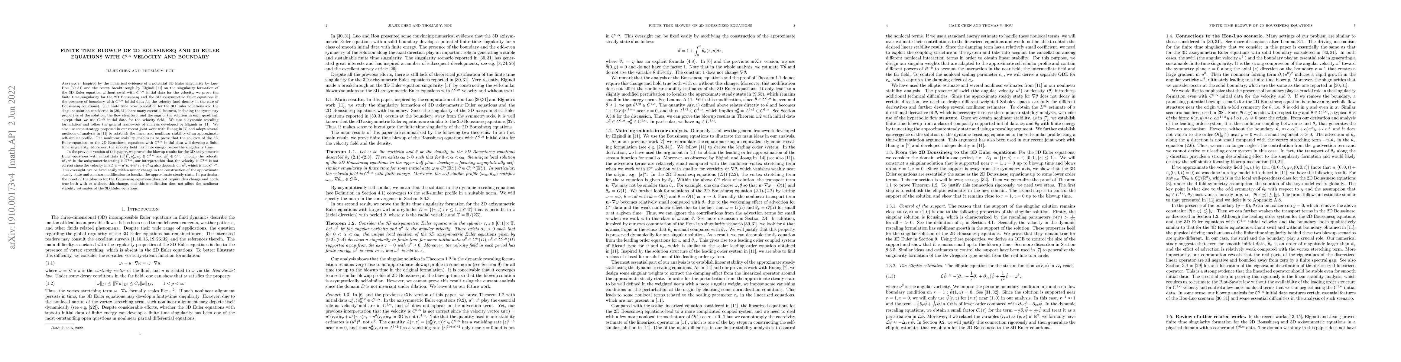 This paper proves the finite time singularity for the 2D Boussinesq and 3D axisymmetric Euler equations with $C^{1,\alpha}$ initial velocity and boundary conditions. The authors utilize a dynamic rescaling and methods from Elgindi's work to establish the nonlinear stability of an approximate self-similar profile, leading to the conclusion that solutions with $C^{1,\alpha}$ data develop singularities in finite time.