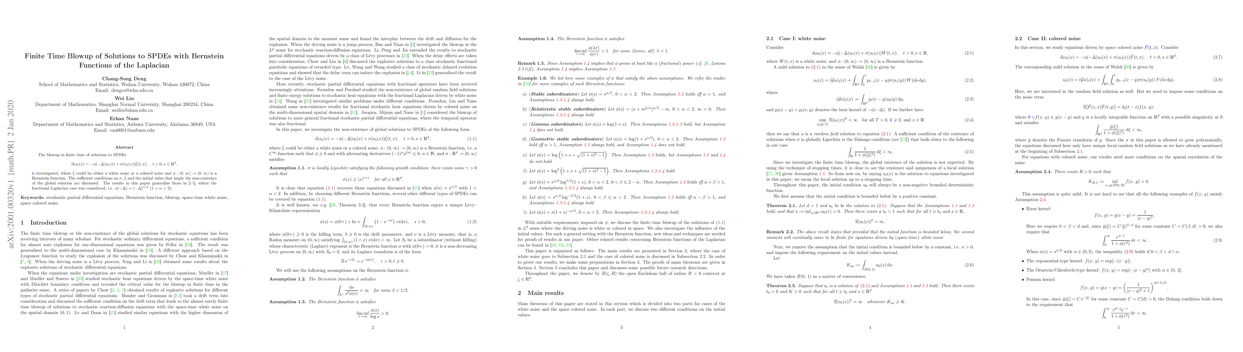 This research investigates the finite time blowup of solutions to certain stochastic partial differential equations (SPDEs), extending previous findings on the fractional Laplacian case. It provides conditions under which global solutions do not exist, involving the Bernstein function of the Laplacian, the noise type, and initial values.