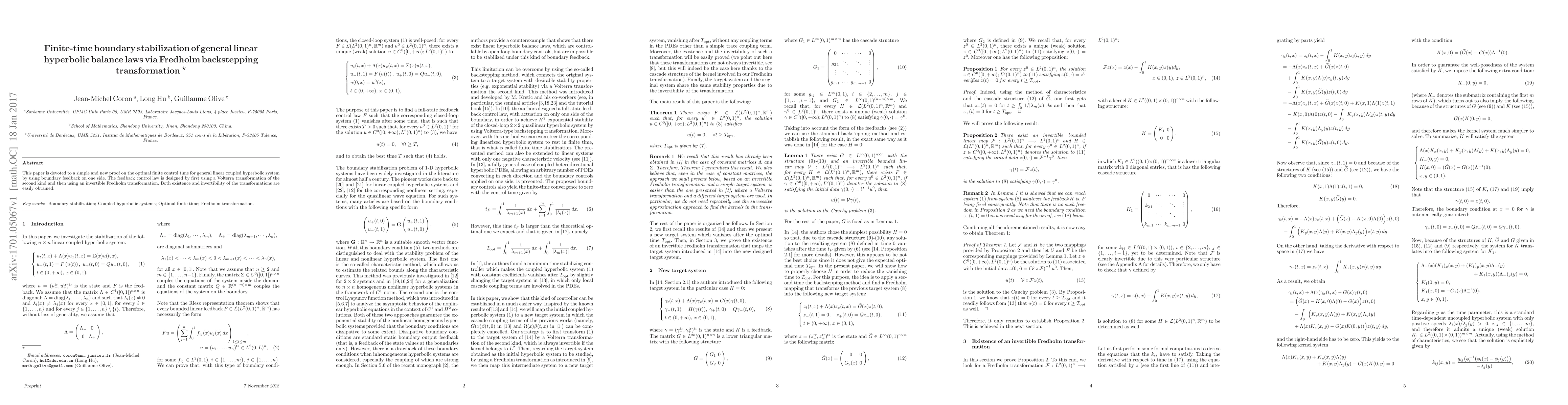 This paper is devoted to a simple and new proof on the optimal finite control time for general linear coupled hyperbolic system by using boundary feedback on one side. The feedback control law is designed by first using a Volterra transformation of the second kind and then using an invertible Fredholm transformation. Both existence and invertibility of the transformations are easily obtained.