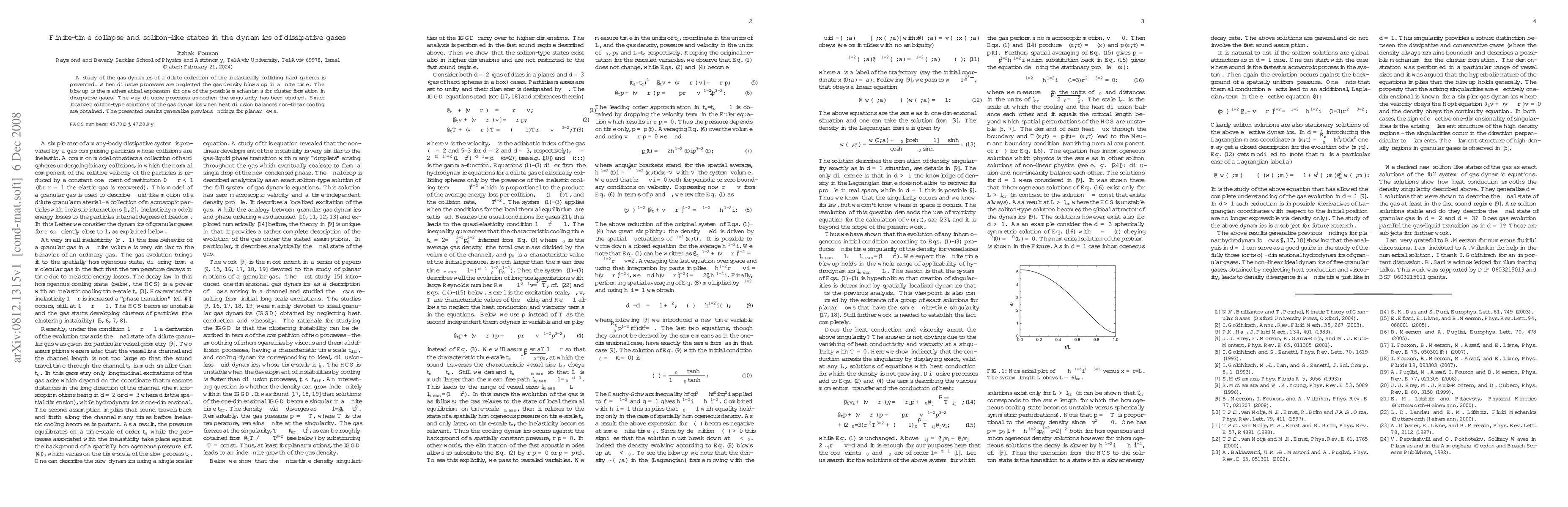 A study of the gas dynamics of a dilute collection of the inelastically colliding hard spheres is presented. When diffusive processes are neglected the gas density blows up in a finite time. The blowup is the mathematical expression for one of the possible mechanisms for cluster formation in dissipative gases. The way diffusive processes smoothen the singularity has been studied. Exact localized soliton-type solutions of the gas dynamics when heat diffusion balances non-linear cooling are obtained. The presented results generalize previous findings for planar flows.
