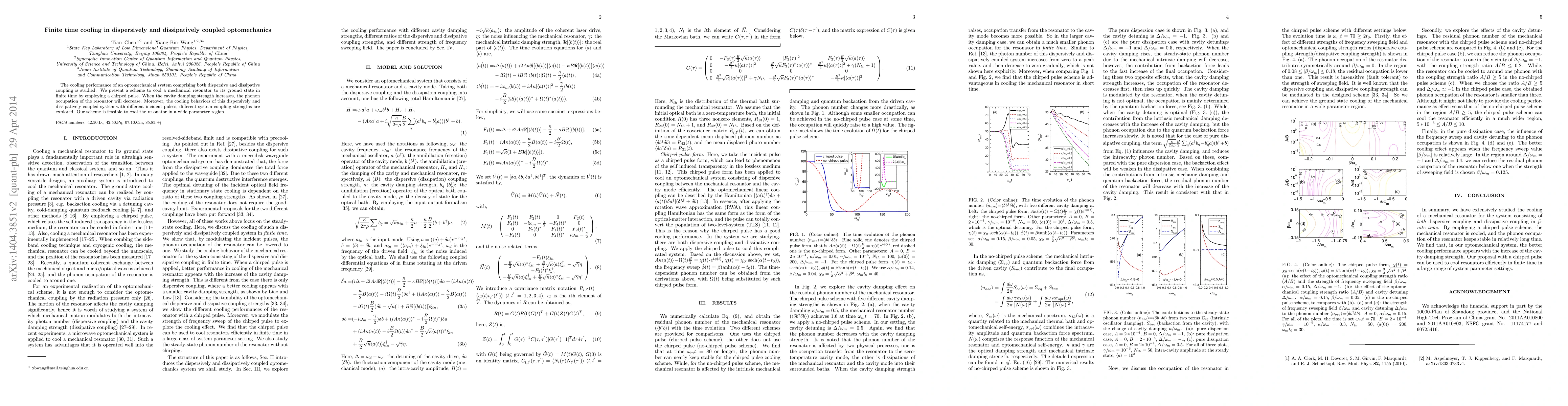 This paper investigates the cooling of an optomechanical system with both dispersive and dissipative coupling, presenting a method to achieve ground state cooling in finite time using chirped pulses. The study explores how varying cavity damping and different coupling strengths affect the cooling performance, demonstrating feasibility across a broad parameter range.
