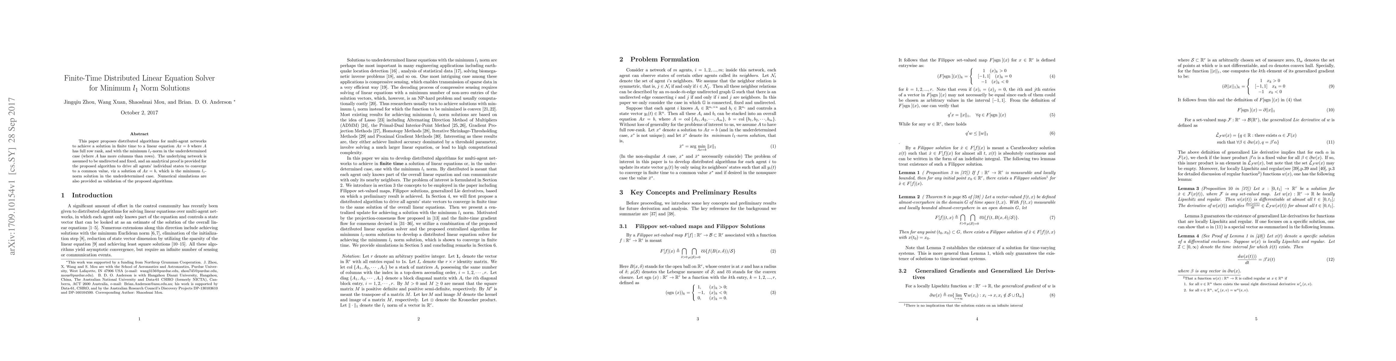 Researchers developed a distributed algorithm to solve linear equations in finite time with minimum $l_1$-norm solutions for underdetermined cases.