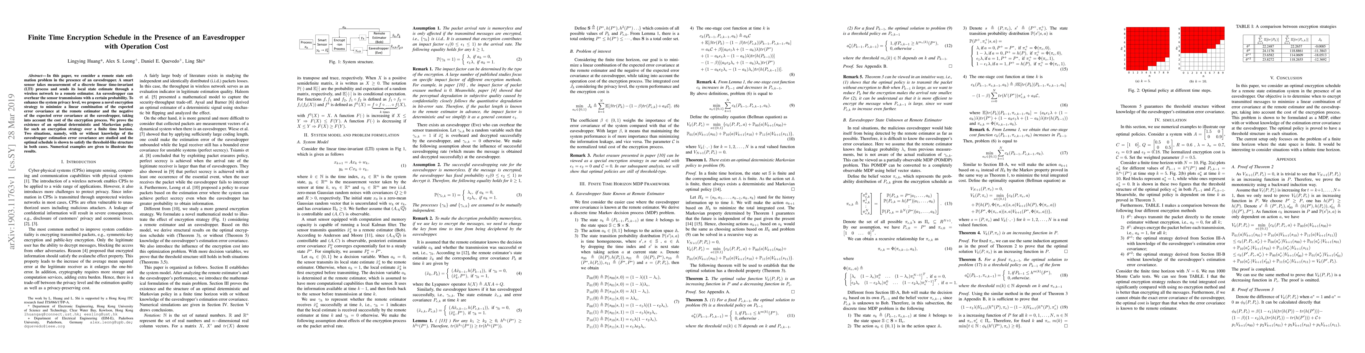 In this paper, we consider a remote state estimation problem in the presence of an eavesdropper. A smart sensor takes measurement of a discrete linear time-invariant (LTI) process and sends its local state estimate through a wireless network to a remote estimator. An eavesdropper can overhear the sensor transmissions with a certain probability. To enhance the system privacy level, we propose a novel encryption strategy to minimize a linear combination of the expected error covariance at the remote estimator and the negative of the expected error covariance at the eavesdropper, taking into account the cost of the encryption process. We prove the existence of an optimal deterministic and Markovian policy for such an encryption strategy over a finite time horizon. Two situations, namely, with or without knowledge of the eavesdropper estimation error covariance are studied and the optimal schedule is shown to satisfy the threshold-like structure in both cases. Numerical examples are given to illustrate the results.
