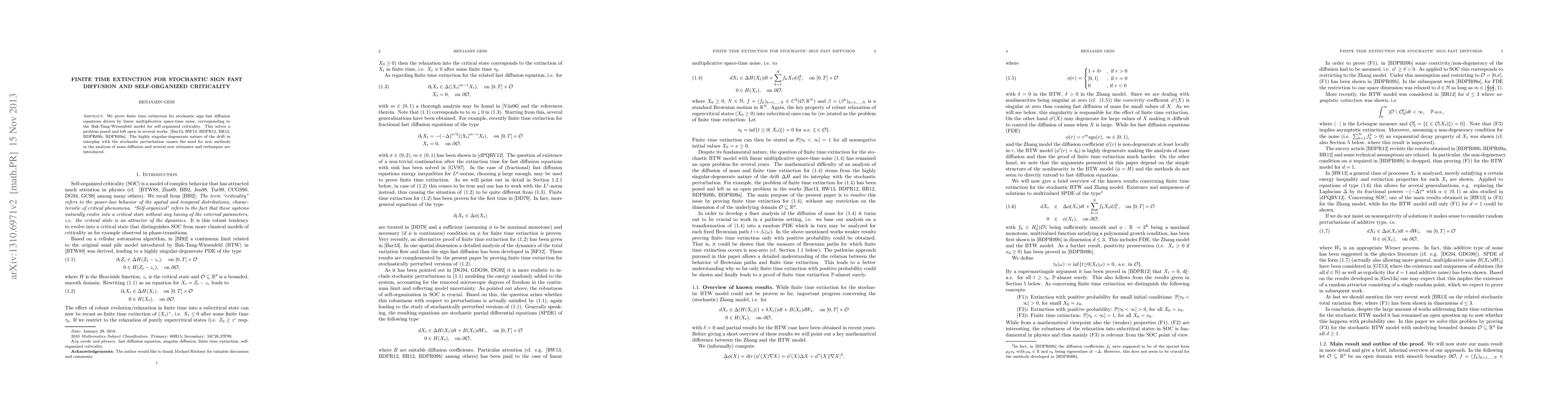 We prove finite time extinction for stochastic sign fast diffusion equations driven by linear multiplicative space-time noise, corresponding to the Bak-Tang-Wiesenfeld model for self-organized criticality. This solves a problem posed and left open in several works: [Barbu, Da Prato, R\"ockner, CMP, 2009], [Barbu, Da Prato, R\"ockner, CRMAS, 2009], [Barbu, R\"ockner, CMP, 2012], [Barbu, Da Prato, R\"ockner, JMAA, 2012], [R\"ockner, Wang, JMLS, 2013], [Barbu, MMAS, 2013]. The highly singular-degenerate nature of the drift in interplay with the stochastic perturbation causes the need for new methods in the analysis of mass diffusion and several new estimates and techniques are introduced.