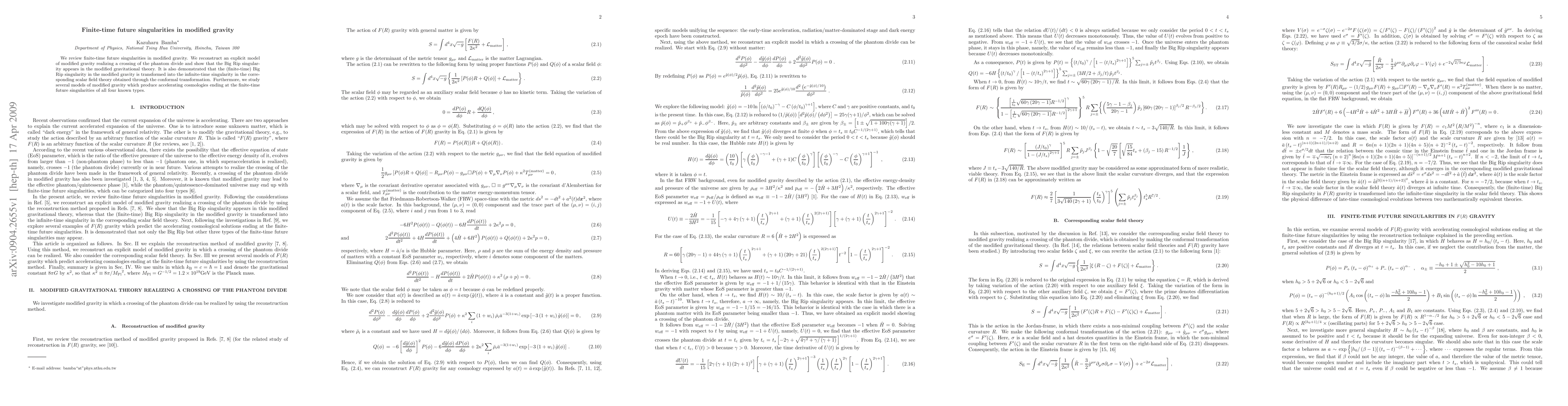This paper reviews finite-time future singularities in modified gravity, constructing a model that crosses the phantom divide and demonstrates the emergence of a Big Rip singularity. It also shows how this singularity transforms under conformal transformations and examines various modified gravity models leading to different types of finite-time future singularities.