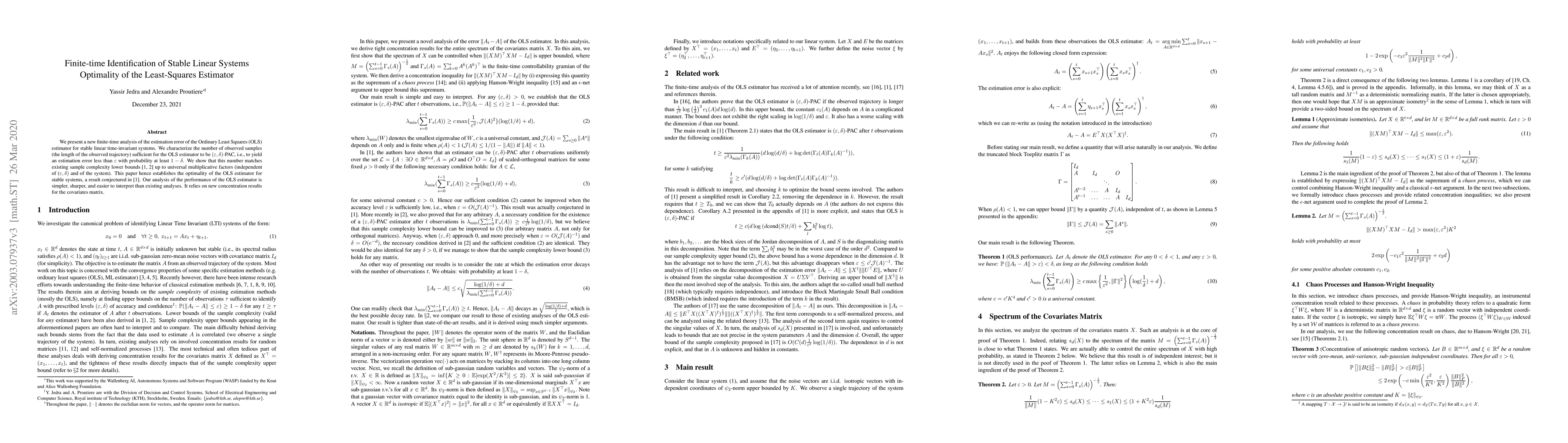 This paper analyzes the Ordinary Least Squares (OLS) estimator for stable linear systems, demonstrating its optimality by showing that the number of samples required for it to achieve a specified estimation error matches existing lower bounds, thus confirming a conjecture from prior work. The analysis provides a simpler, sharper, and more interpretable method based on new concentration results for the covariates matrix.