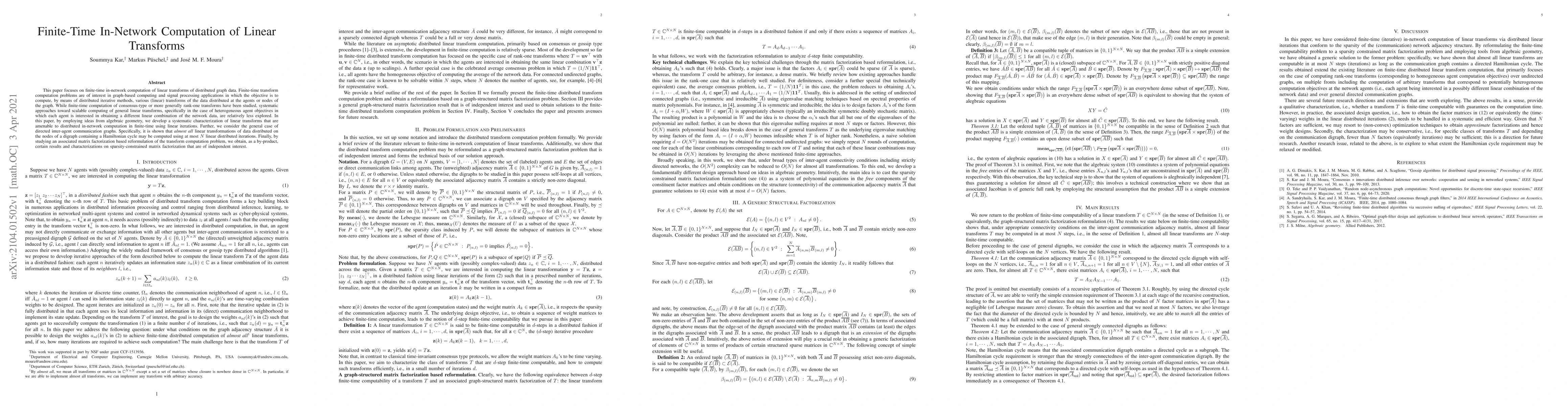 This paper focuses on finite-time in-network computation of linear transforms of distributed graph data. Finite-time transform computation problems are of interest in graph-based computing and signal processing applications in which the objective is to compute, by means of distributed iterative methods, various (linear) transforms of the data distributed at the agents or nodes of the graph. While finite-time computation of consensus-type or more generally rank-one transforms have been studied, systematic approaches toward scalable computing of general linear transforms, specifically in the case of heterogeneous agent objectives in which each agent is interested in obtaining a different linear combination of the network data, are relatively less explored. In this paper, by employing ideas from algebraic geometry, we develop a systematic characterization of linear transforms that are amenable to distributed in-network computation in finite-time using linear iterations. Further, we consider the general case of directed inter-agent communication graphs. Specifically, it is shown that \emph{almost all} linear transformations of data distributed on the nodes of a digraph containing a Hamiltonian cycle may be computed using at most $N$ linear distributed iterations. Finally, by studying an associated matrix factorization based reformulation of the transform computation problem, we obtain, as a by-product, certain results and characterizations on sparsity-constrained matrix factorization that are of independent interest.