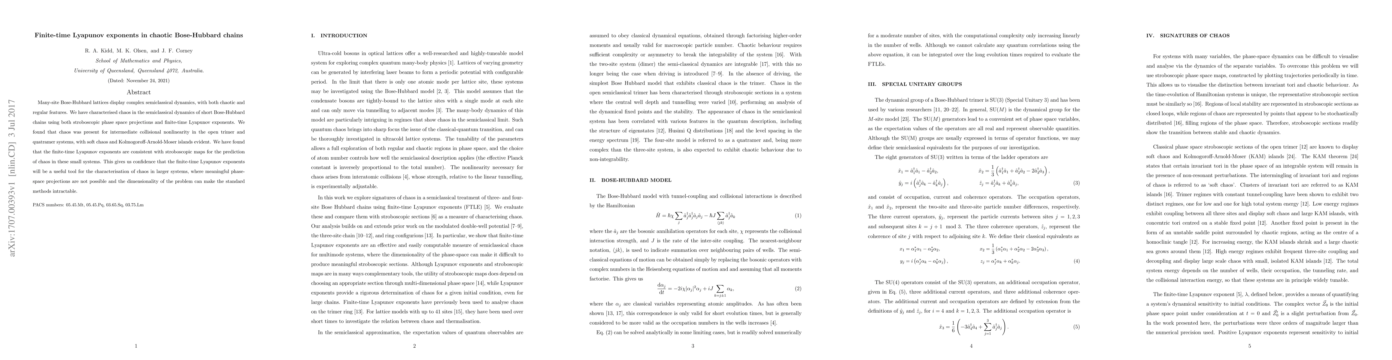 Many-site Bose-Hubbard lattices display complex semiclassical dynamics, with both chaotic and regular features. We have characterised chaos in the semiclassical dynamics of short Bose-Hubbard chains using both stroboscopic phase space projections and finite-time Lyapunov exponents. We found that chaos was present for intermediate collisional nonlinearity in the open trimer and quatramer systems, with soft chaos and Kolmogoroff-Arnold-Moser islands evident. We have found that the finite-time Lyapunov exponents are consistent with stroboscopic maps for the prediction of chaos in these small systems. This gives us confidence that the finite-time Lyapunov exponents will be a useful tool for the characterisation of chaos in larger systems, where meaningful phase-space projections are not possible and the dimensionality of the problem can make the standard methods intractable.