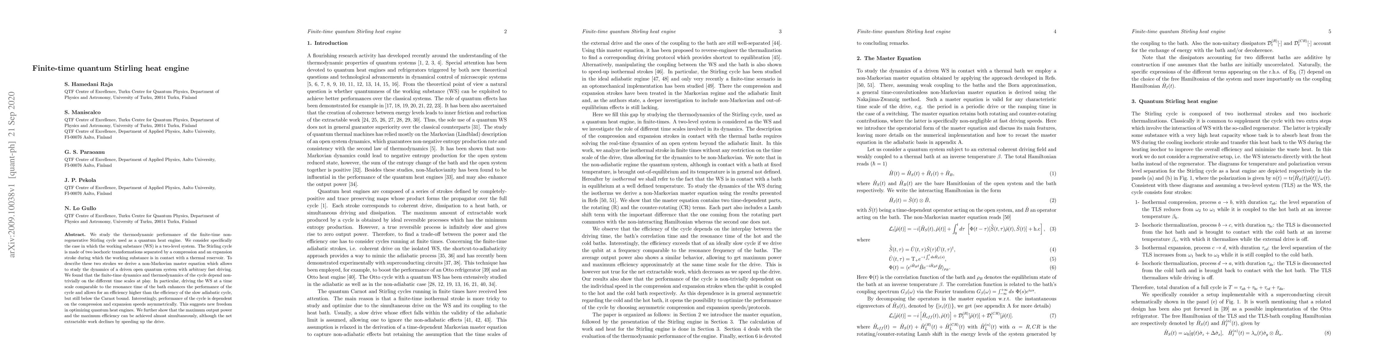 We study the thermodynamic performance of the finite-time non-regenerative Stirling cycle used as a quantum heat engine. We consider specifically the case in which the working substance (WS) is a two-level system. The Stirling cycle is made of two isochoric transformations separated by a compression and an expansion stroke during which the working substance is in contact with a thermal reservoir. To describe these two strokes we derive a non-Markovian master equation which allows to study the dynamics of a driven open quantum system with arbitrary fast driving. We found that the finite-time dynamics and thermodynamics of the cycle depend non-trivially on the different time scales at play. In particular, driving the WS at a time scale comparable to the resonance time of the bath enhances the performance of the cycle and allows for an efficiency higher than the efficiency of the slow adiabatic cycle, but still below the Carnot bound. Interestingly, performance of the cycle is dependent on the compression and expansion speeds asymmetrically. This suggests new freedom in optimizing quantum heat engines. We further show that the maximum output power and the maximum efficiency can be achieved almost simultaneously, although the net extractable work declines by speeding up the drive.