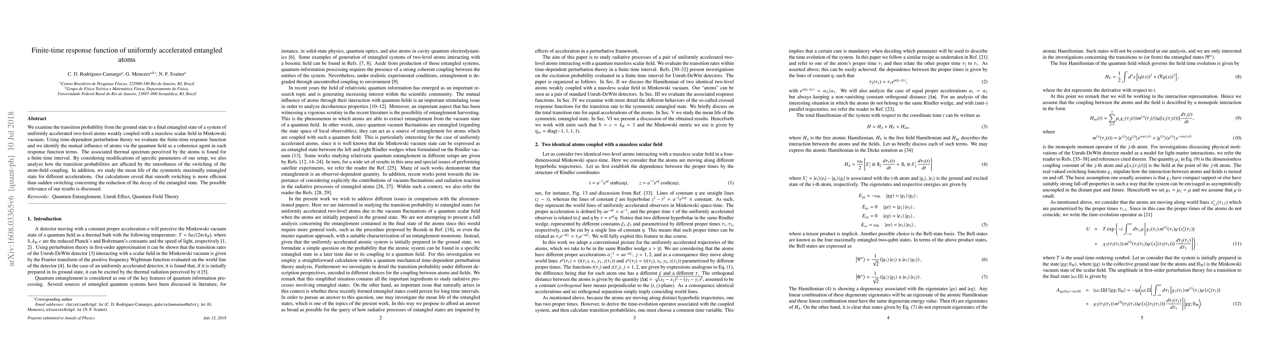 We examine the transition probability from the ground state to a final entangled state of a system of uniformly accelerated two-level atoms weakly coupled with a massless scalar field in Minkowski vacuum. Using time-dependent perturbation theory we evaluate the finite-time response function and we identify the mutual influence of atoms via the quantum field as a coherence agent in each response function terms. The associated thermal spectrum perceived by the atoms is found for a finite time interval. By considering modifications of specific parameters of our setup, we also analyze how the transition probabilities are affected by the smoothness of the switching of the atom-field coupling. In addition, we study the mean life of the symmetric maximally entangled state for different accelerations. Our calculations reveal that smooth switching is more efficient than sudden switching concerning the reduction of the decay of the entangled state. The possible relevance of our results is discussed.