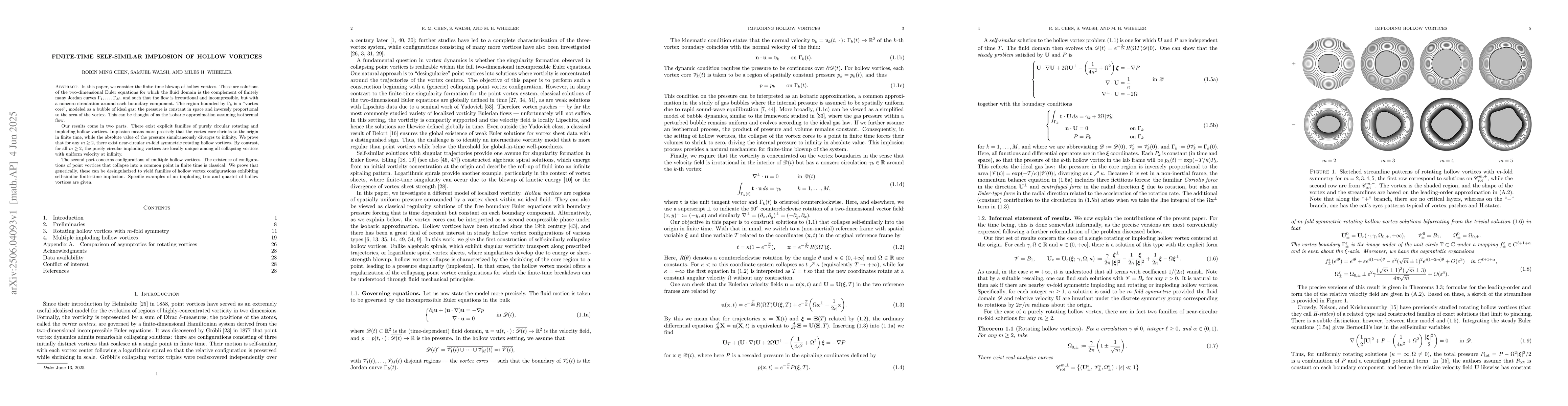 The paper presents mathematical proofs for the existence of specific hollow vortex configurations and their finite-time implosion properties.