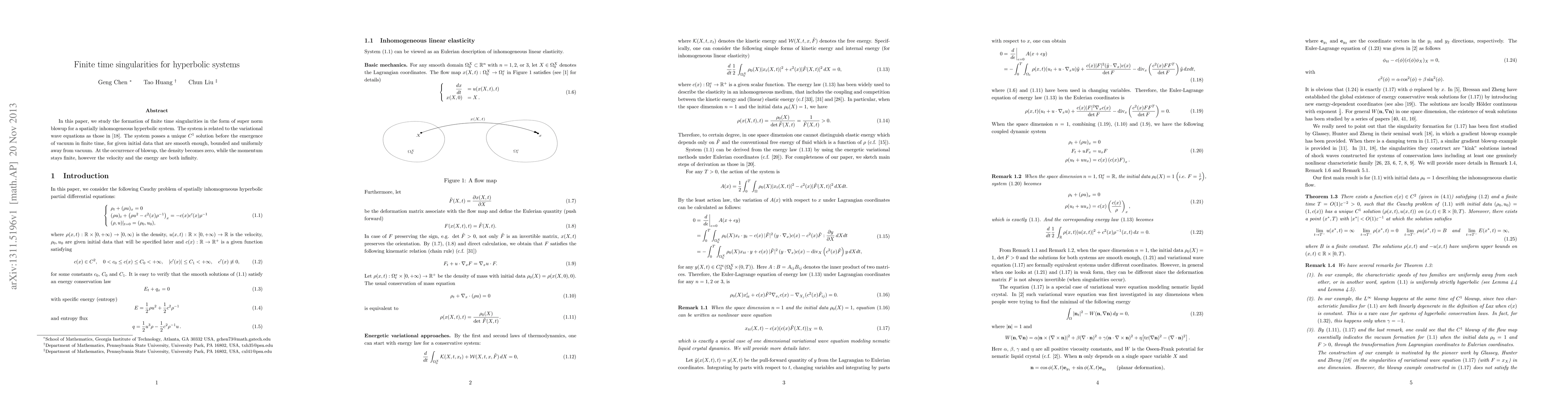 In this paper, we study the formation of finite time singularities in the form of super norm blowup for a spatially inhomogeneous hyperbolic system. The system is related to the variational wave equations as those in [18]. The system posses a unique $C^1$ solution before the emergence of vacuum in finite time, for given initial data that are smooth enough, bounded and uniformly away from vacuum. At the occurrence of blowup, the density becomes zero, while the momentum stays finite, however the velocity and the energy are both infinity.