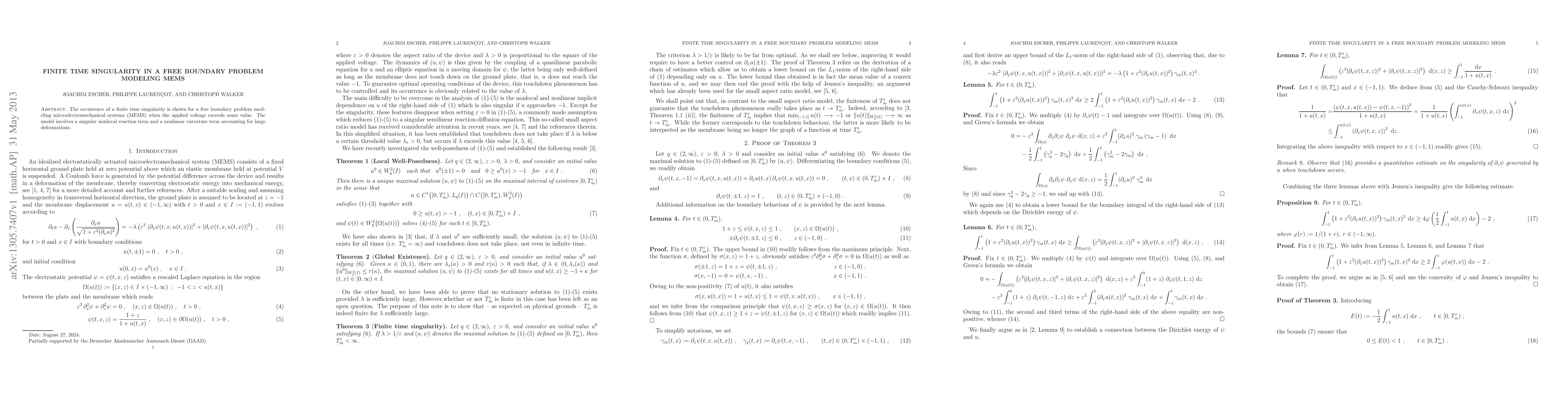 This paper demonstrates the emergence of a finite time singularity in a free boundary model for MEMS when the applied voltage surpasses a critical threshold. The model incorporates a singular nonlocal reaction term and a nonlinear curvature term to account for significant deformations.