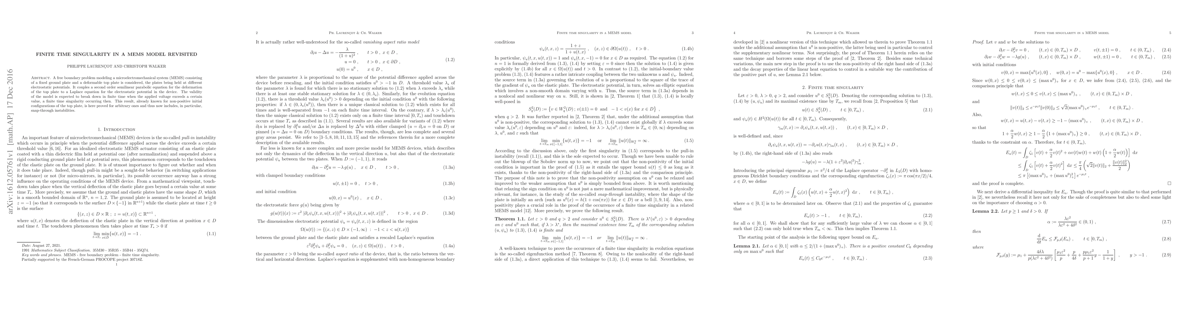 This paper revisits a MEMS model where a deformable top plate interacts with a fixed ground plate under different electrostatic potentials, leading to a finite time singularity when the applied voltage exceeds a critical value. The authors prove this phenomenon for arbitrary initial configurations, extending beyond previously known non-positive cases and including snap-through instabilities.