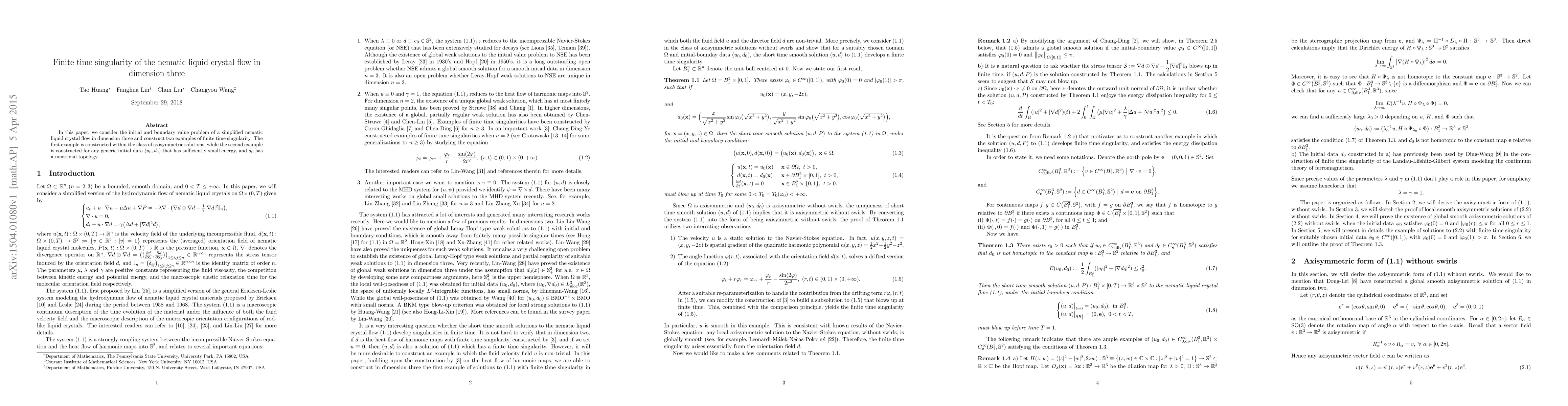 This paper constructs two examples of finite time singularities for a simplified three-dimensional nematic liquid crystal flow, demonstrating that singularities can arise both in axisymmetric solutions and from generic initial data with low energy.