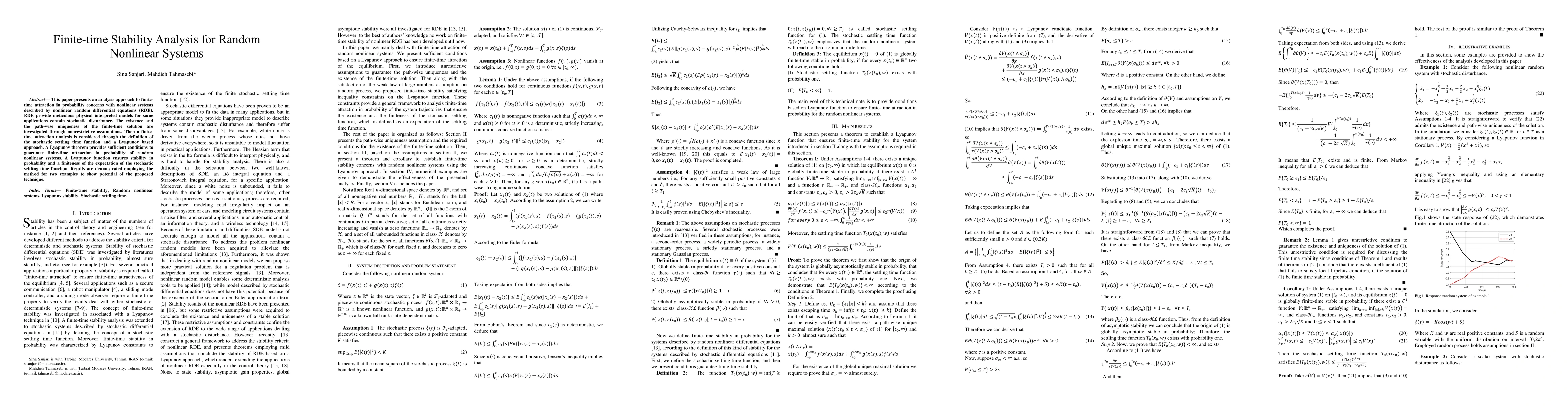 The paper introduces a Lyapunov theorem and unrestrictive assumptions for finite-time stability analysis of random nonlinear systems described by RDE.