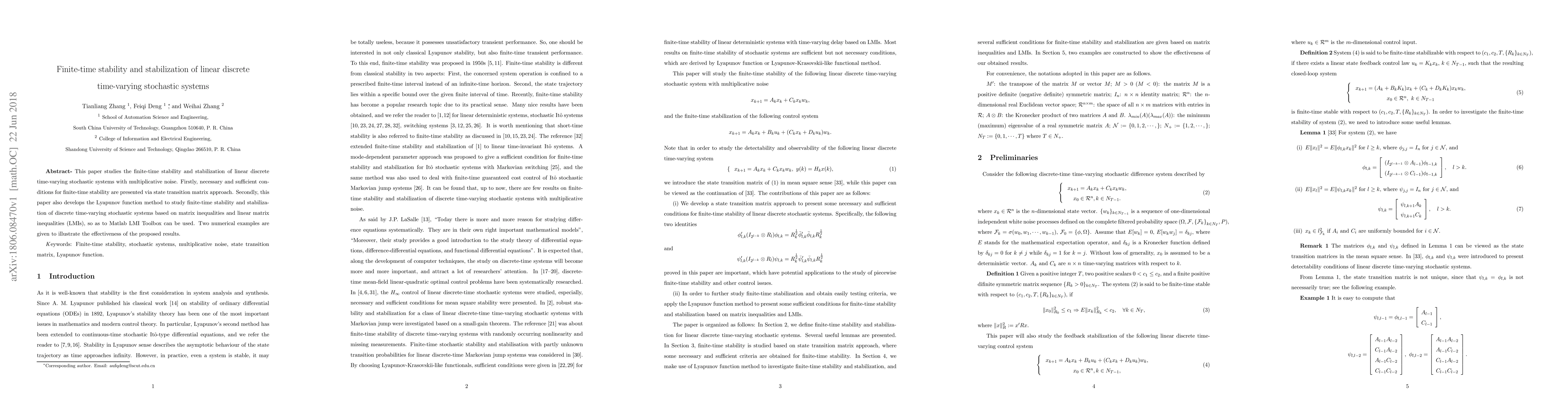 This paper investigates finite-time stability and stabilization for linear discrete time-varying stochastic systems with multiplicative noise, presenting necessary and sufficient conditions via state transition matrices and developing a Lyapunov function method based on matrix inequalities and LMIs for practical implementation using the Matlab LMI Toolbox. Numerical examples validate the proposed methods.