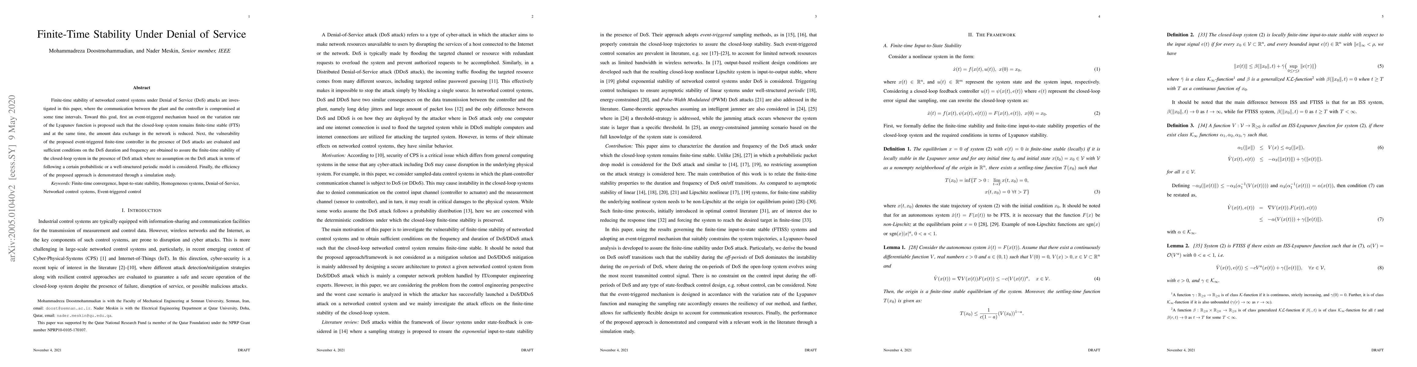 Finite-time stability of networked control systems under Denial of Service (DoS) attacks are investigated in this paper, where the communication between the plant and the controller is compromised at some time intervals. Toward this goal, first an event-triggered mechanism based on the variation rate of the Lyapunov function is proposed such that the closed-loop system remains finite-time stable (FTS) and at the same time, the amount data exchange in the network is reduced. Next, the vulnerability of the proposed event-triggered finite-time controller in the presence of DoS attacks are evaluated and sufficient conditions on the DoS duration and frequency are obtained to assure the finite-time stability of the closed-loop system in the presence of DoS attack where no assumption on the DoS attack in terms of following a certain probabilistic or a well-structured periodic model is considered. Finally, the efficiency of the proposed approach is demonstrated through a simulation study.