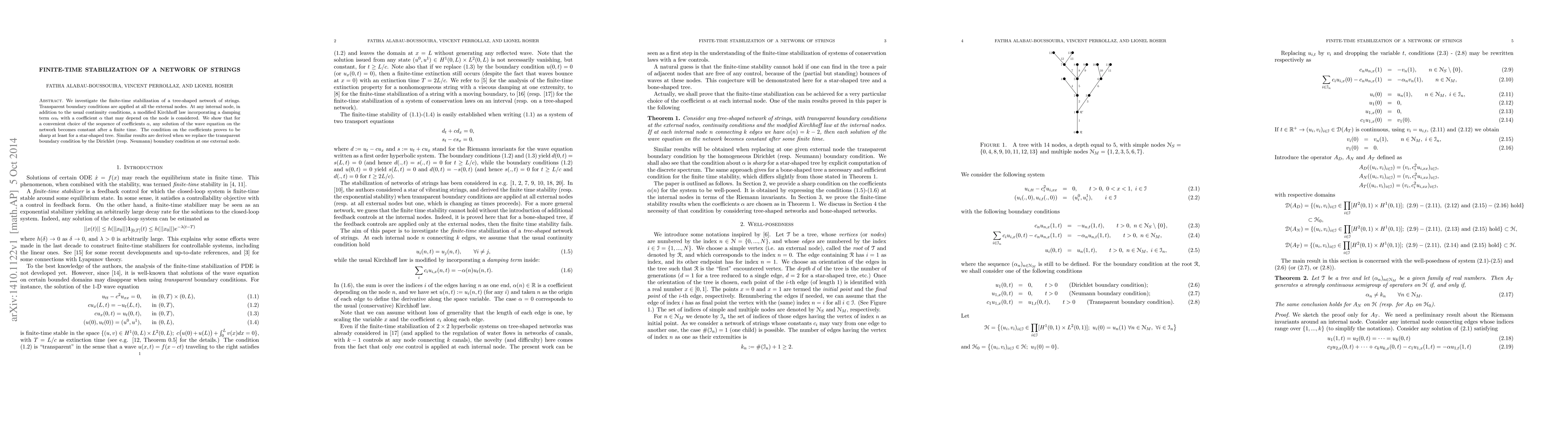 We investigate the finite-time stabilization of a tree-shaped network of strings. Transparent boundary conditions are applied at all the external nodes. At any internal node, in addition to the usual continuity conditions, a modified Kirchhoff law incorporating a damping term $\alpha u_t$ with a coefficient $\alpha$ that may depend on the node is considered. We show that for a convenient choice of the sequence of coefficients $\alpha$, any solution of the wave equation on the network becomes constant after a finite time. The condition on the coefficients proves to be sharp at least for a star-shaped tree. Similar results are derived when we replace the transparent boundary condition by the Dirichlet (resp. Neumann) boundary condition at one external node.