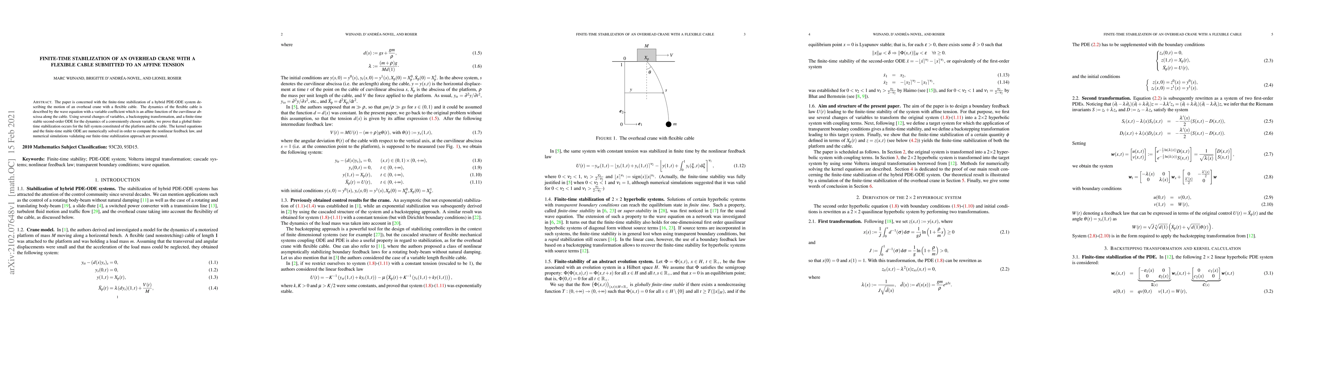 The paper is concerned with the finite-time stabilization of a hybrid PDE-ODE system describing the motion of an overhead crane with a flexible cable. The dynamics of the flexible cable is described by the wave equation with a variable coefficient which is an affine function of the curvilinear abscissa along the cable. Using several changes of variables, a backstepping transformation, and a finite-time stable second-order ODE for the dynamics of a conveniently chosen variable, we prove that a global finite-time stabilization occurs for the full system constituted of the platform and the cable. The kernel equations and the finite-time stable ODE are numerically solved in order to compute the nonlinear feedback law, and numerical simulations validating our finite-time stabilization approach are presented.