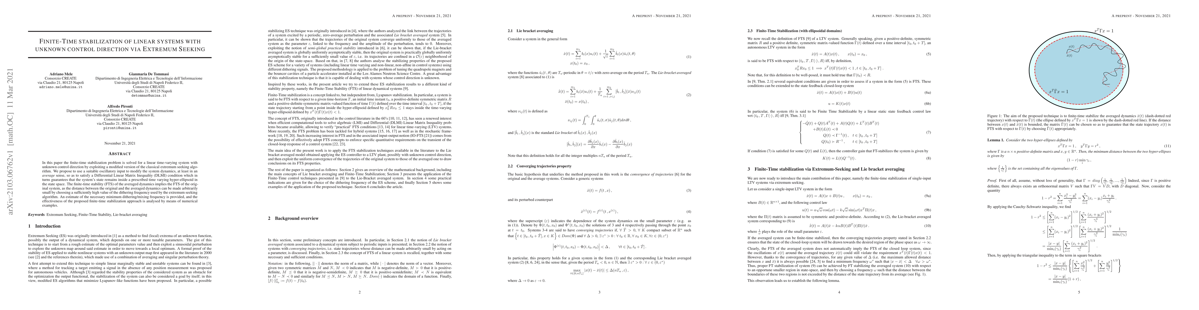 In this paper the finite-time stabilization problem is solved for a linear time-varying system with unknown control direction by exploiting a modified version of the classical extremum seeking algorithm. We propose to use a suitable oscillatory input to modify the system dynamics, at least in an average sense, so as to satisfy a Differential Linear Matrix Inequality (DLMI) condition which in turns guarantees that the system's state remains inside a prescribed time varying hyper-ellipsoid in the state space. The finite-time stability (FTS) of the averaged dynamics implies the FTS of the original system, as the distance between the original and the averaged dynamics can be made arbitrarily small by choosing a sufficiently high value of the dithering frequency used by the extremum seeking algorithm. An estimate of the necessary minimum dithering/mixing frequency is provided, and the effectiveness of the proposed finite-time stabilization approach is analysed by means of numerical examples.
