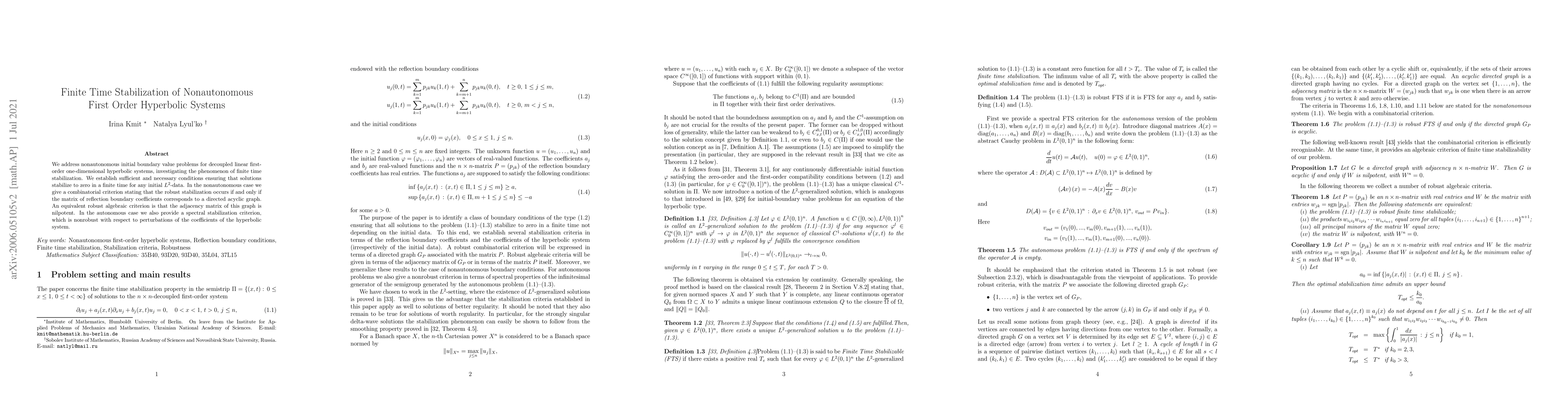 The paper investigates finite time stabilization for nonautonomous linear first-order hyperbolic systems, providing necessary and sufficient conditions for stabilization to zero. For nonautonomous systems, it introduces a combinatorial criterion linked to directed acyclic graphs and a robust algebraic nilpotent criterion for stabilization.