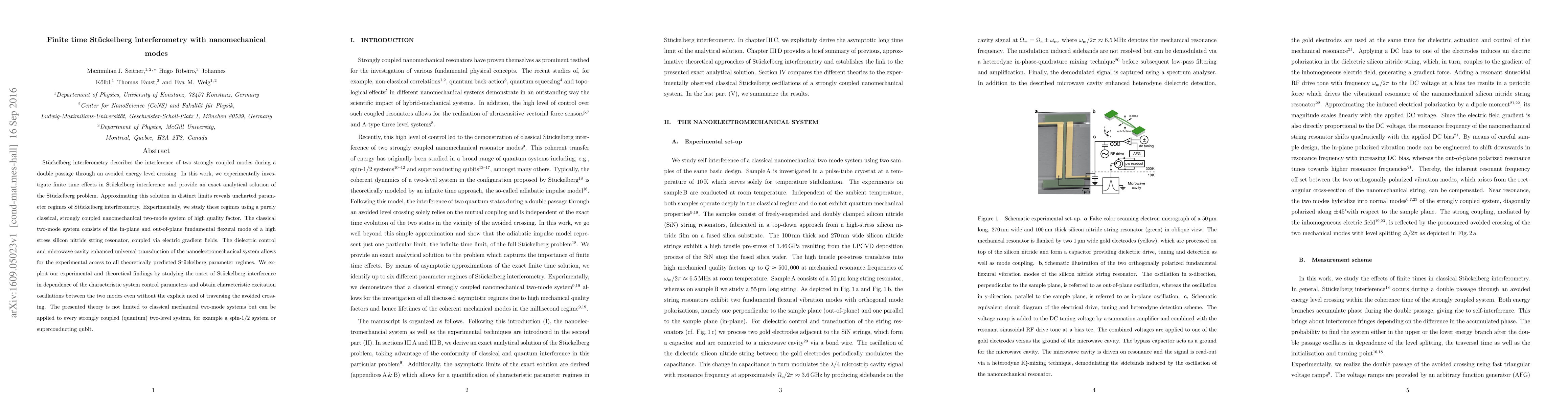 This paper investigates finite time effects in St\"uckelberg interferometry using a nanomechanical two-mode system, providing an exact analytical solution and exploring new parameter regimes. The study reveals characteristic excitation oscillations between modes without traversing avoided crossings, with implications for both classical and quantum two-level systems.