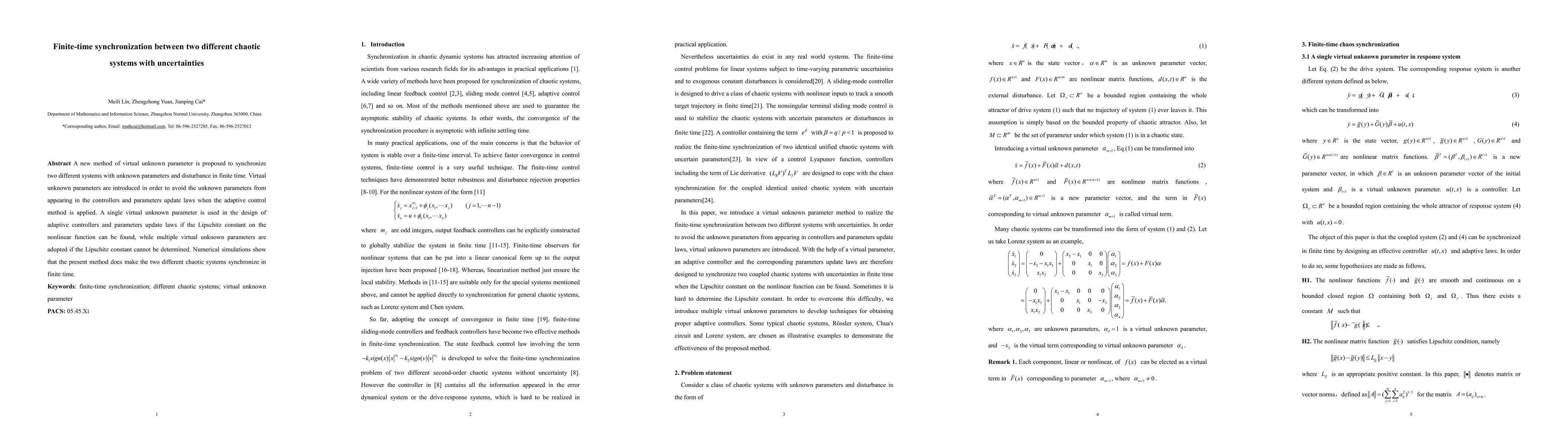 A new method is proposed to synchronize two chaotic systems with unknown parameters and disturbances in finite time using virtual unknown parameters. Numerical simulations show that the method can achieve synchronization in a short time.