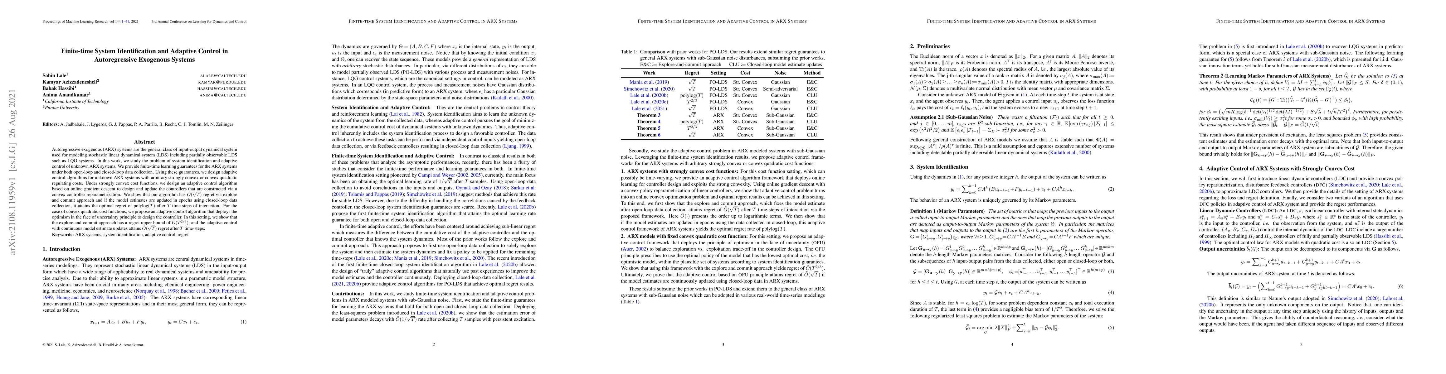 This paper addresses system identification and adaptive control for autoregressive exogenous (ARX) systems, providing finite-time learning guarantees under both open-loop and closed-loop data collection. It proposes adaptive control algorithms for strongly convex and convex quadratic regulating costs, achieving optimal regret bounds through explore and commit strategies.