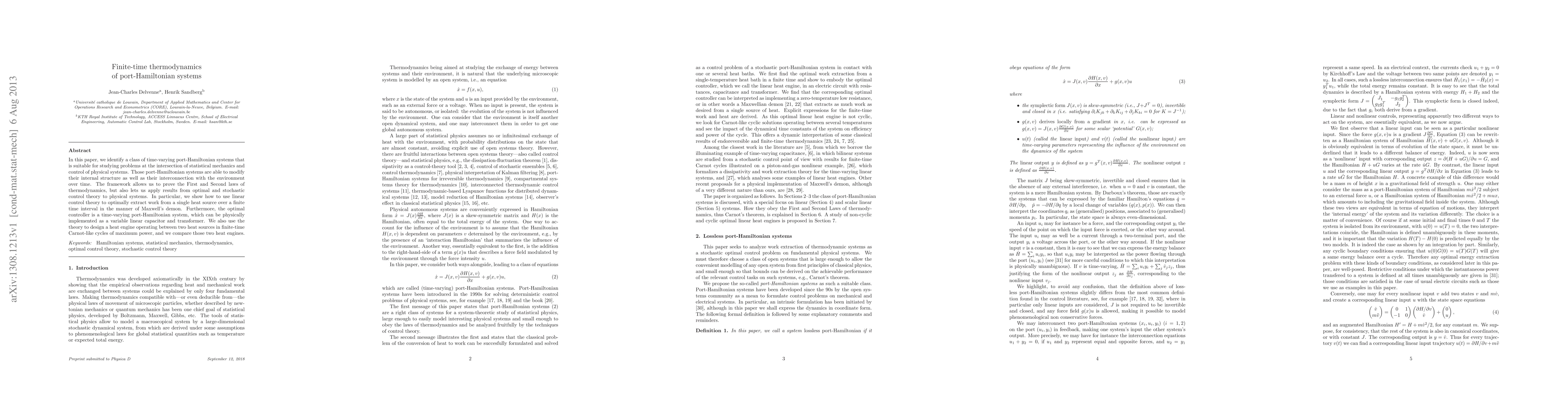 In this paper, we identify a class of time-varying port-Hamiltonian systems that is suitable for studying problems at the intersection of statistical mechanics and control of physical systems. Those port-Hamiltonian systems are able to modify their internal structure as well as their interconnection with the environment over time. The framework allows us to prove the First and Second laws of thermodynamics, but also lets us apply results from optimal and stochastic control theory to physical systems. In particular, we show how to use linear control theory to optimally extract work from a single heat source over a finite time interval in the manner of Maxwell's demon. Furthermore, the optimal controller is a time-varying port-Hamiltonian system, which can be physically implemented as a variable linear capacitor and transformer. We also use the theory to design a heat engine operating between two heat sources in finite-time Carnot-like cycles of maximum power, and we compare those two heat engines.