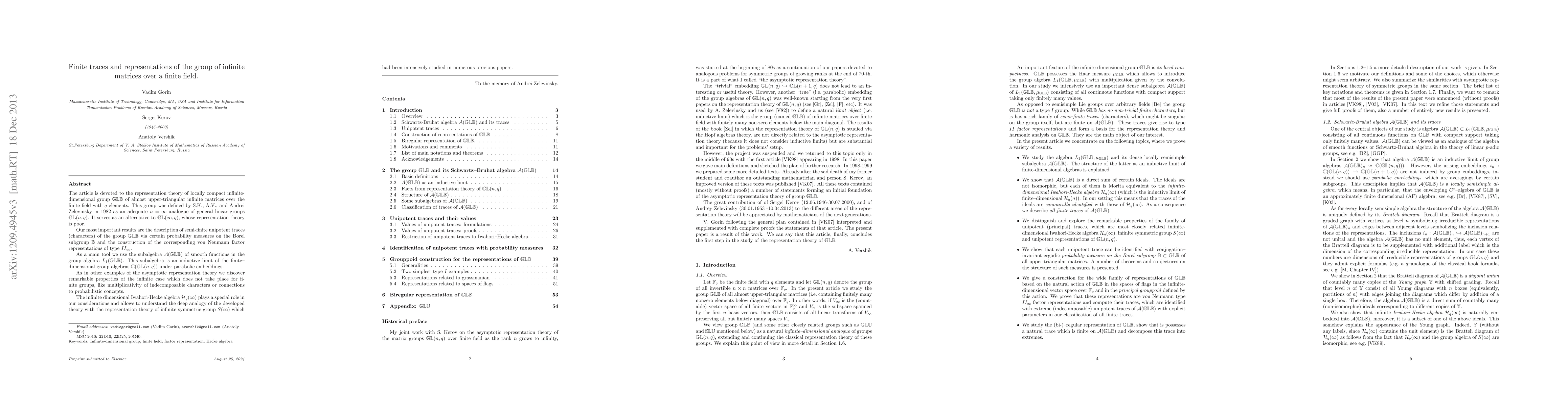 The article is devoted to the representation theory of locally compact infinite-dimensional group $\mathbb{GLB}$ of almost upper-triangular infinite matrices over the finite field with $q$ elements. This group was defined by S.K., A.V., and Andrei Zelevinsky in 1982 as an adequate $n=\infty$ analogue of general linear groups $\mathbb{GL}(n,q)$. It serves as an alternative to $\mathbb{GL}(\infty,q)$, whose representation theory is poor. Our most important results are the description of semi-finite unipotent traces (characters) of the group $\mathbb{ GLB}$ via certain probability measures on the Borel subgroup $\mathbb{B}$ and the construction of the corresponding von Neumann factor representations of type $II_\infty$. As a main tool we use the subalgebra $\mathcal A(\mathbb{ GLB})$ of smooth functions in the group algebra $L_1(\mathbb{GLB})$. This subalgebra is an inductive limit of the finite--dimensional group algebras ${\mathbb C}(\mathbb{GL}(n,q))$ under parabolic embeddings. As in other examples of the asymptotic representation theory we discover remarkable properties of the infinite case which does not take place for finite groups, like multiplicativity of indecomposable characters or connections to probabilistic concepts. The infinite dimensional Iwahori-Hecke algebra $\mathcal H_q(\infty)$ plays a special role in our considerations and allows to understand the deep analogy of the developed theory with the representation theory of infinite symmetric group $S(\infty)$ which had been intensively studied in numerous previous papers.