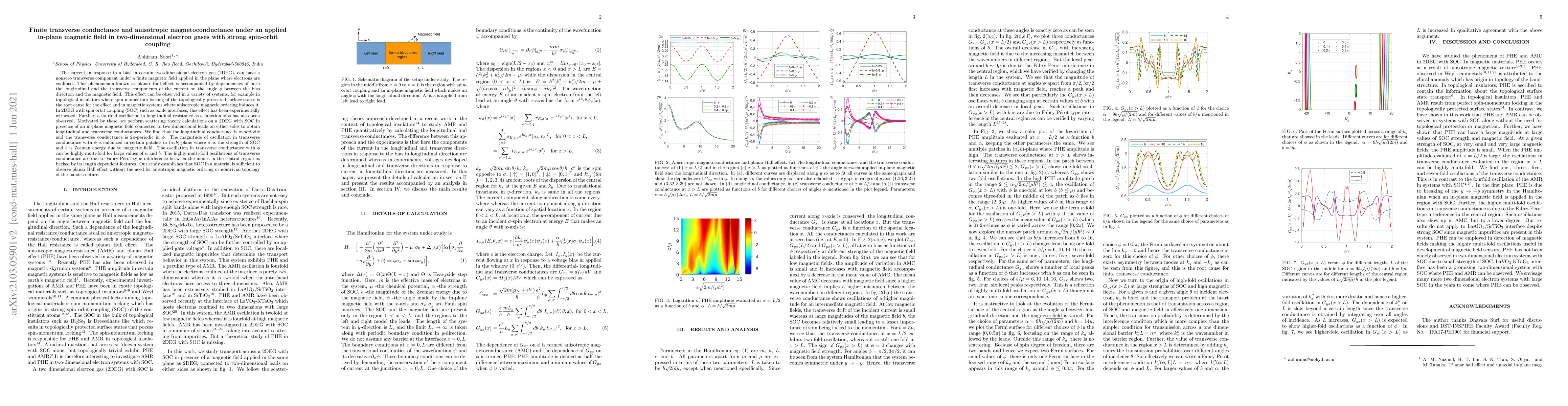 The current in response to a bias in certain two-dimensional electron gas (2DEG), can have a nonzero transverse component under a finite magnetic field applied in the plane where electrons are confined. This phenomenon known as planar Hall effect is accompanied by dependencies of both the longitudinal and the transverse components of the current on the angle $\phi$ between the bias direction and the magnetic field. In 2DEG with spin orbit coupling (SOC) such as oxide interfaces, this effect has been experimentally witnessed. Further, a fourfold oscillation in longitudinal resistance as a function of $\phi$ has also been observed. Motivated by these, we perform scattering theory calculations on a 2DEG with SOC in presence of an in-plane magnetic field connected to two dimensional leads on either sides to obtain longitudinal and transverse conductances. We find that the longitudinal conductance is $\pi$-periodic and the transverse conductance is $2\pi$-periodic in $\phi$. The magnitude of oscillation in transverse conductance with $\phi$ is enhanced in certain patches in $(\alpha,b)$-plane where $\alpha$ is the strength of SOC and $b$ is Zeeman energy due to magnetic field. The oscillation in transverse conductance with $\phi$ can be highly multi-fold for large values of $\alpha$ and $b$. The highly multi-fold oscillations of transverse conductance are due to Fabry-P\'erot type interference between the modes in the central region as backed by its length dependent features. Our study establishes that SOC in a material is sufficient to observe planar Hall effect without the need for anisotropic magnetic ordering or nontrivial topology of the bandstructure.