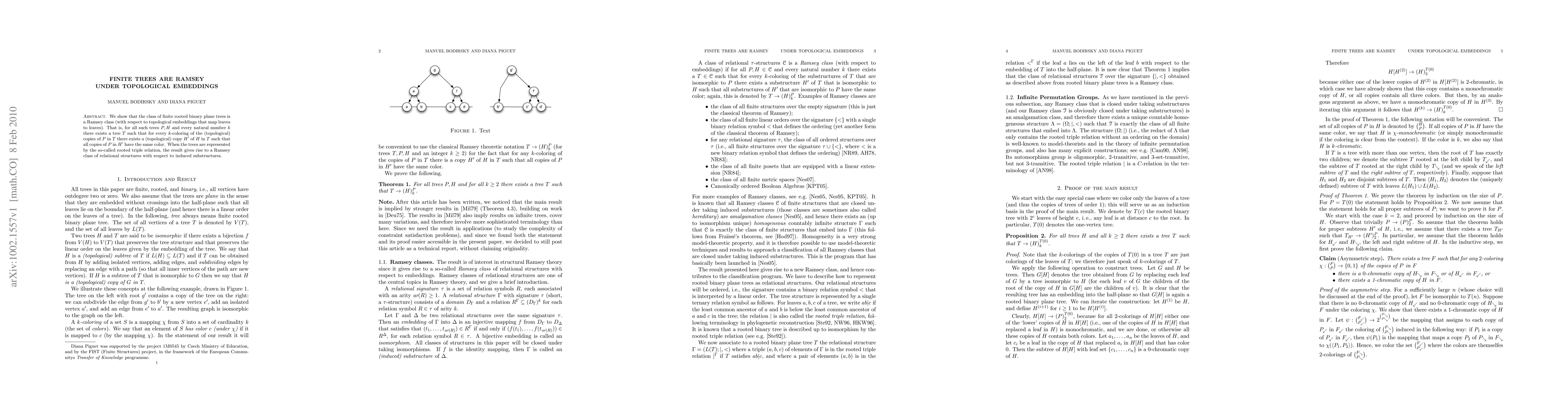 Finite rooted binary plane trees exhibit a Ramsey property under topological embeddings, meaning that for any tree P, coloring its copies in another tree T with k colors always allows finding a subtree H' of the same size where all copies of P have the same color.