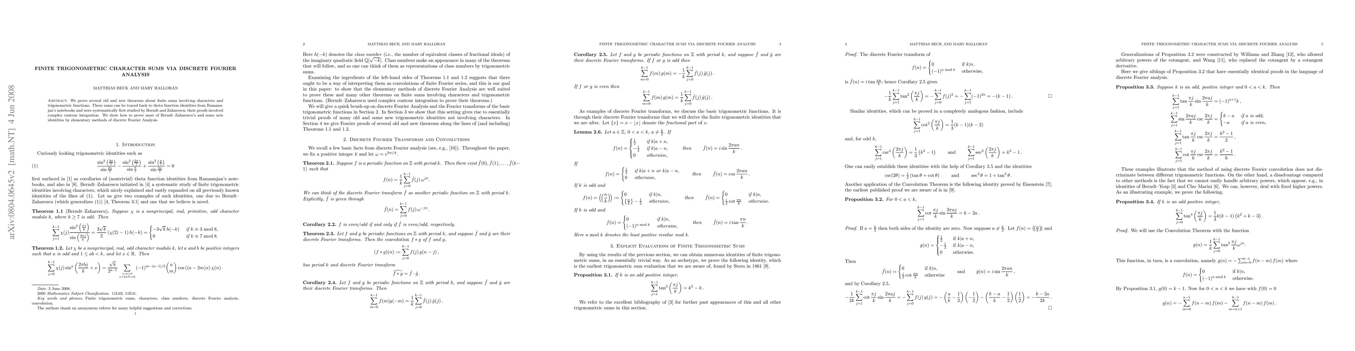 This paper demonstrates the use of discrete Fourier analysis to prove old and new theorems on finite sums involving characters and trigonometric functions, replacing traditional complex contour integration methods with elementary techniques.