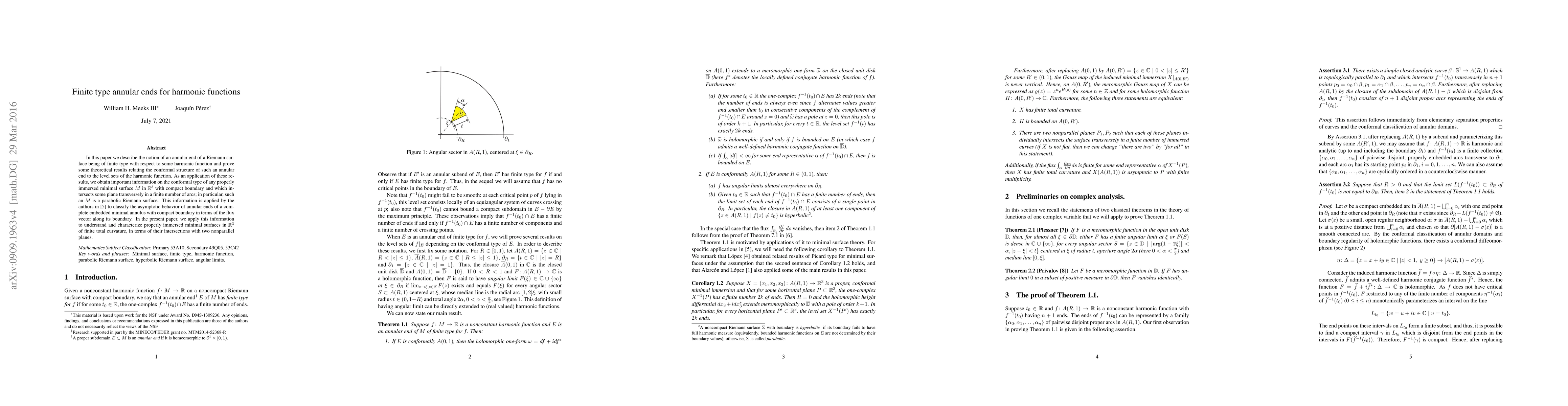 In this paper we describe the notion of an annular end of a Riemann surface being of finite type with respect to some harmonic function and prove some theoretical results relating the conformal structure of such an annular end to the level sets of the harmonic function. We then apply these results to understand and characterize properly immersed minimal surfaces in $\mathbb{R}^3$ of finite total curvature, in terms of their intersections with two nonparallel planes.